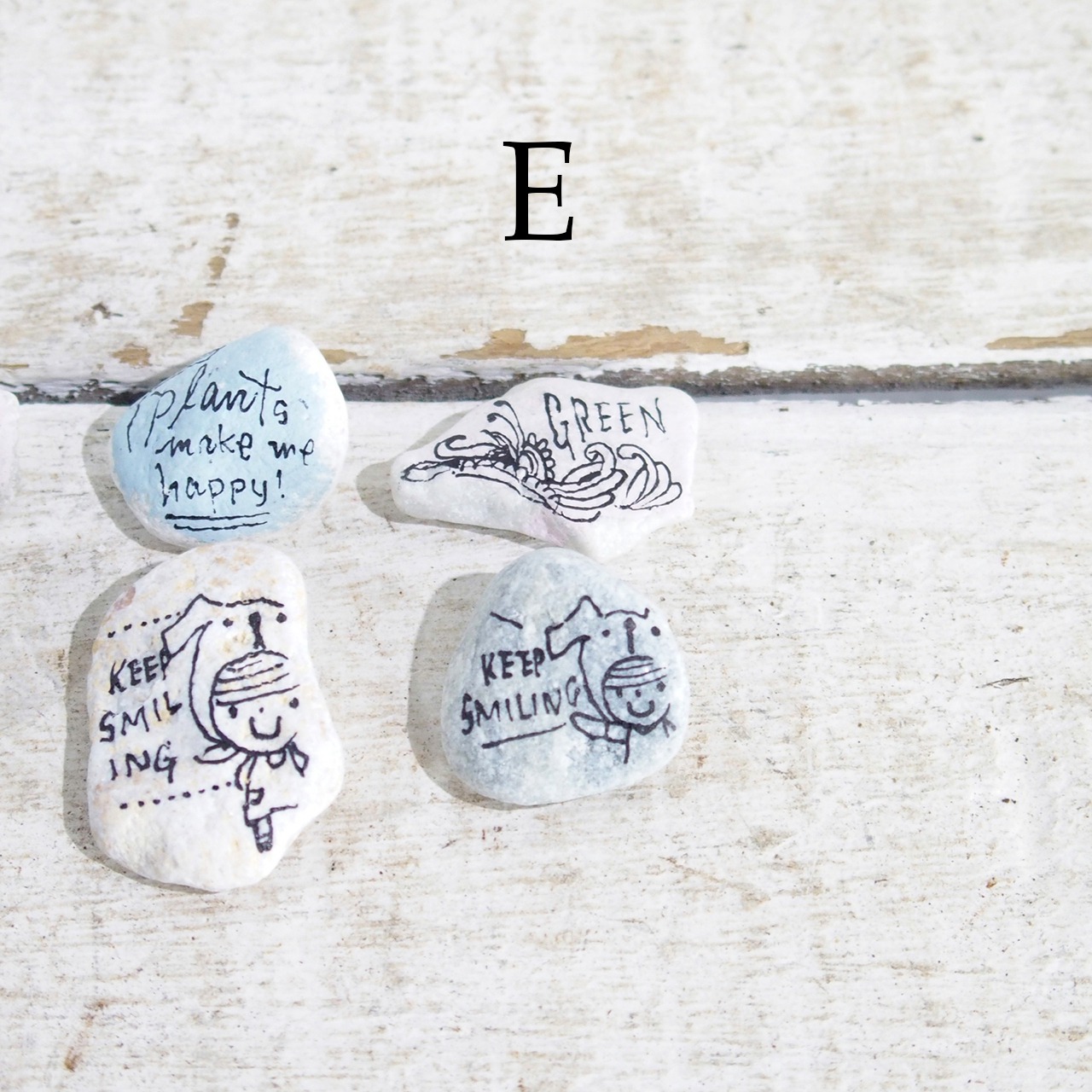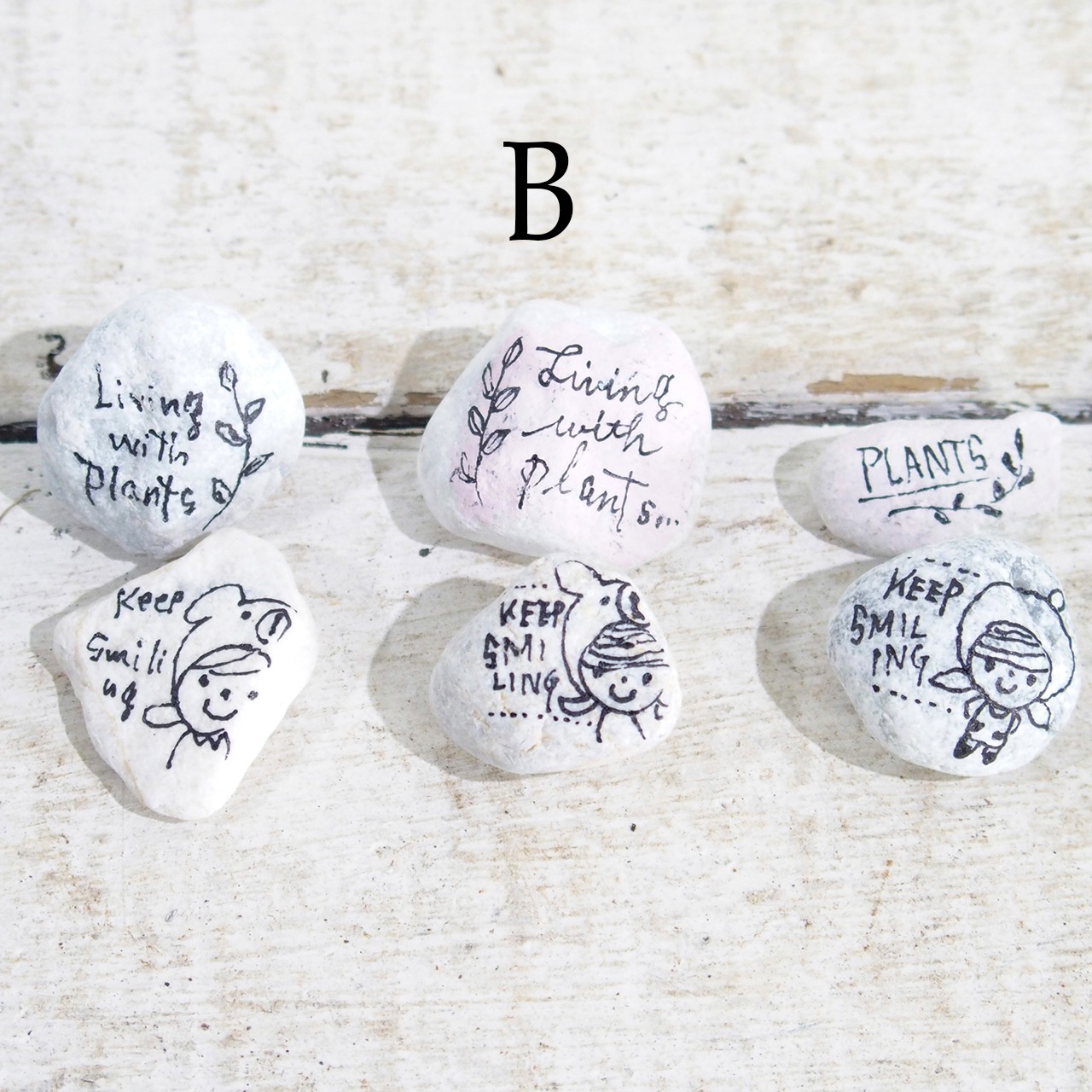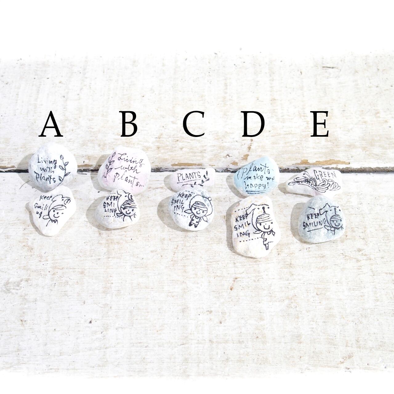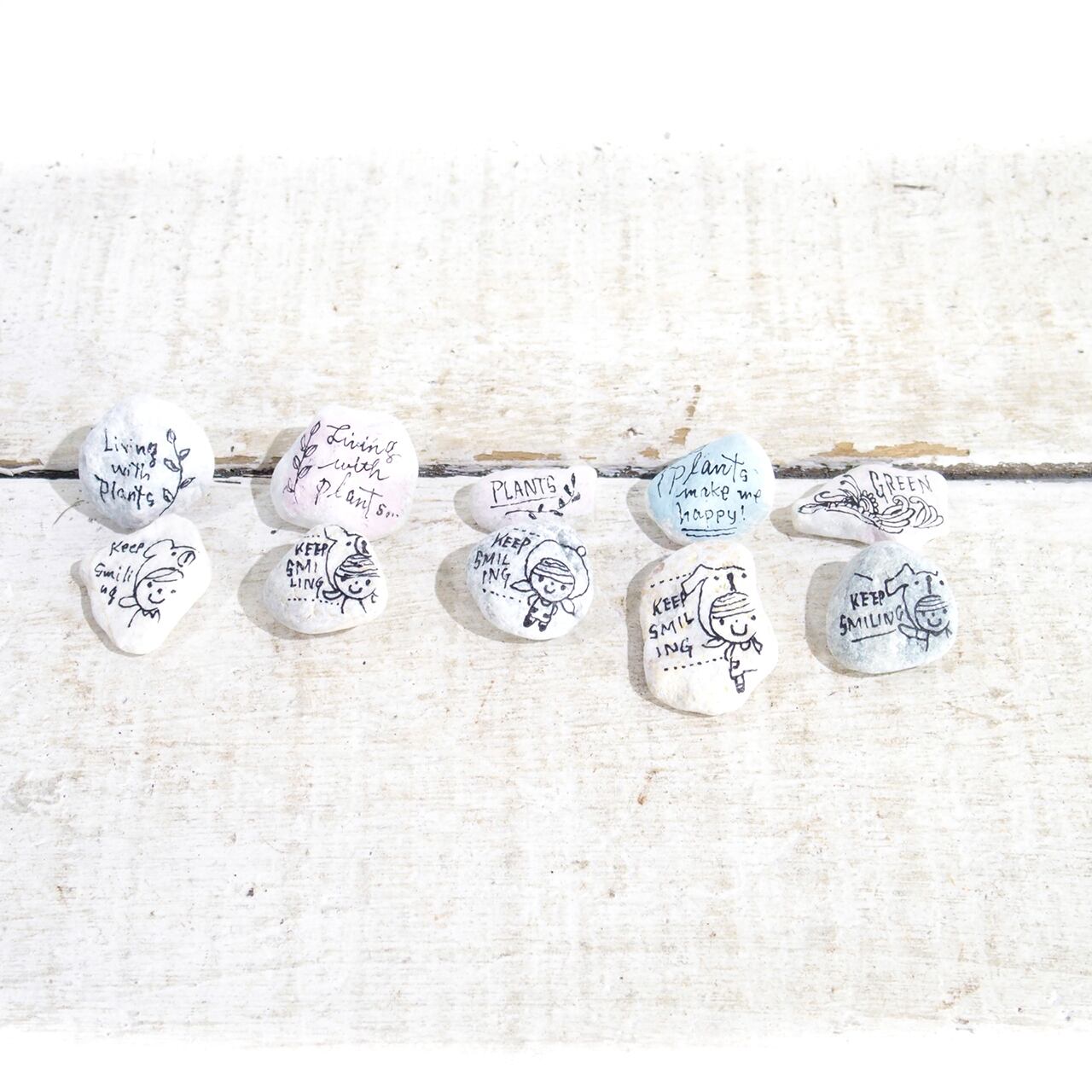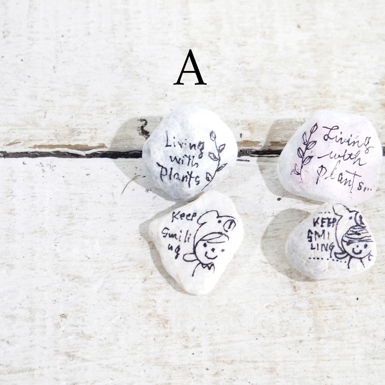 色も形も様々な「小石」に文字や顔を描いたもの、2個セットでの販売です♪