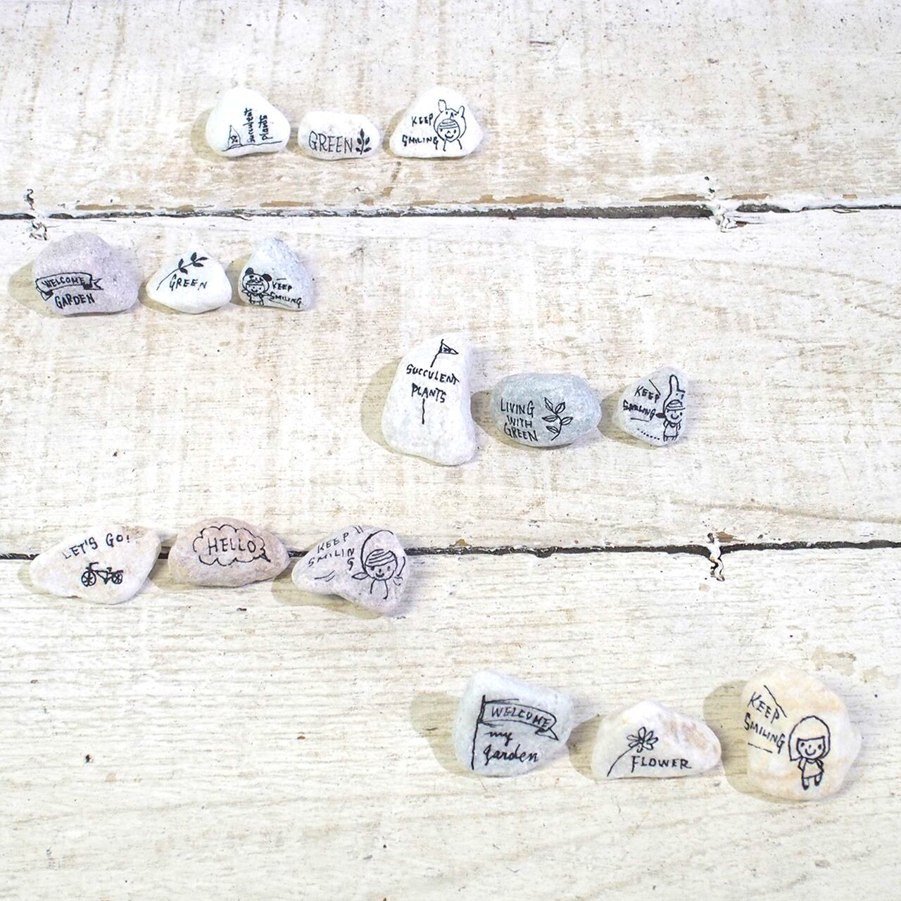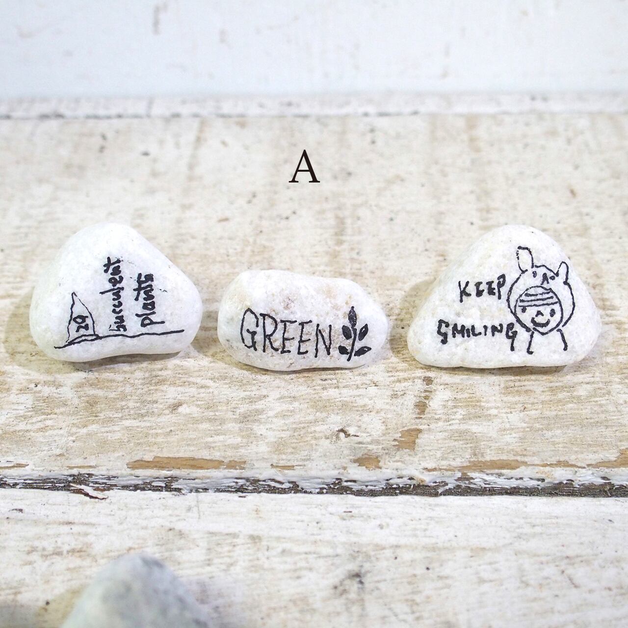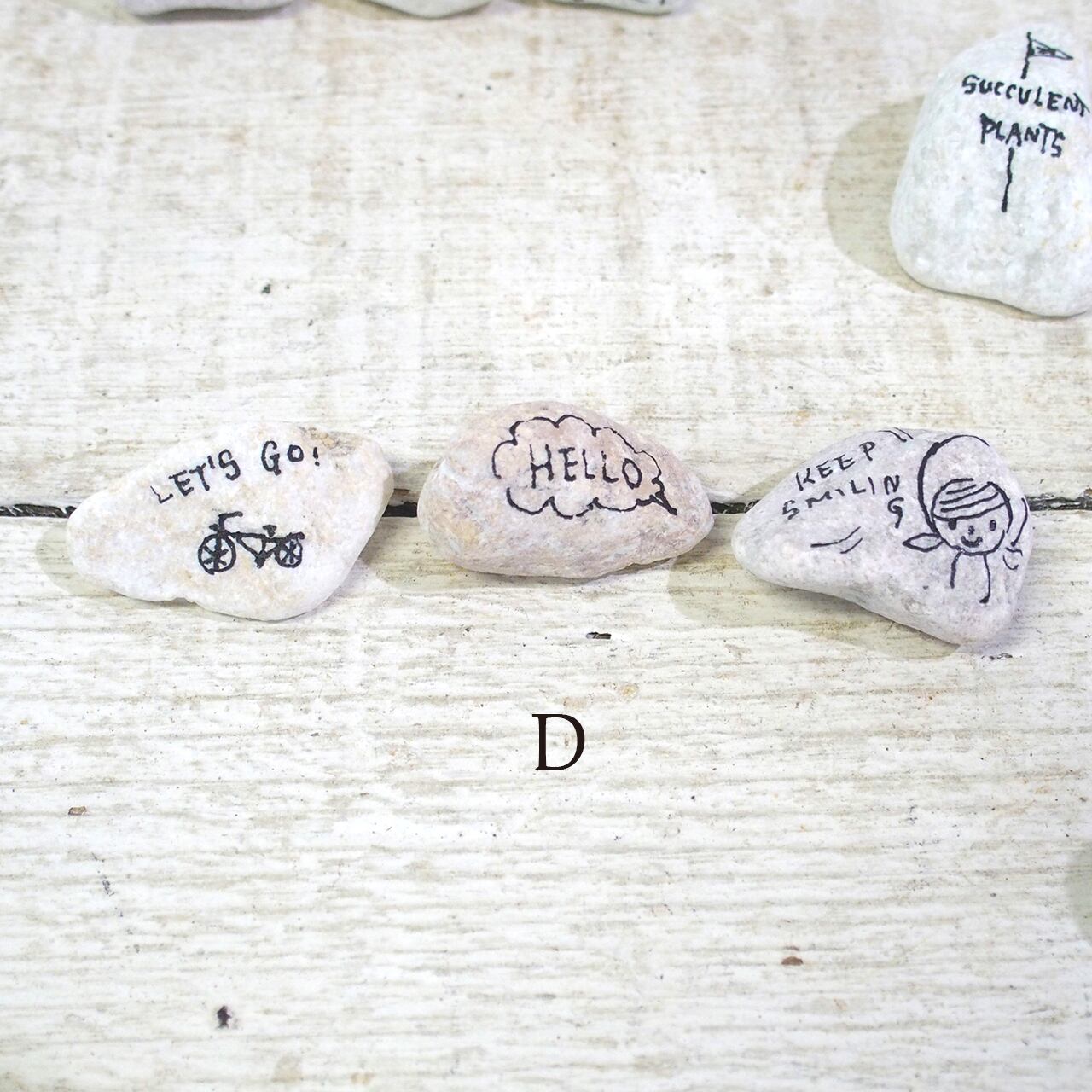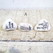 色も形も様々な「小石」に文字やイラストを描いたもの、3個セットでの販売です♪