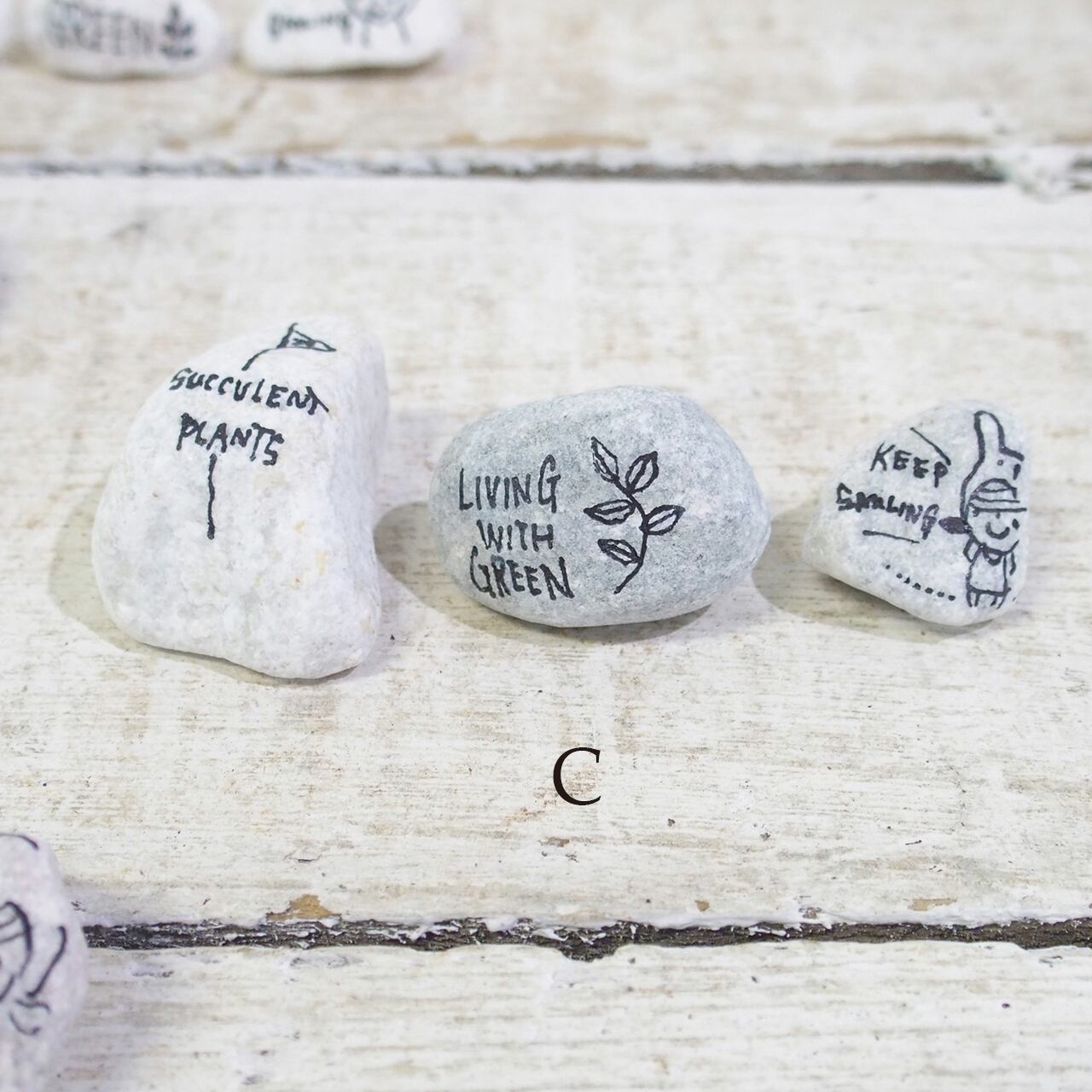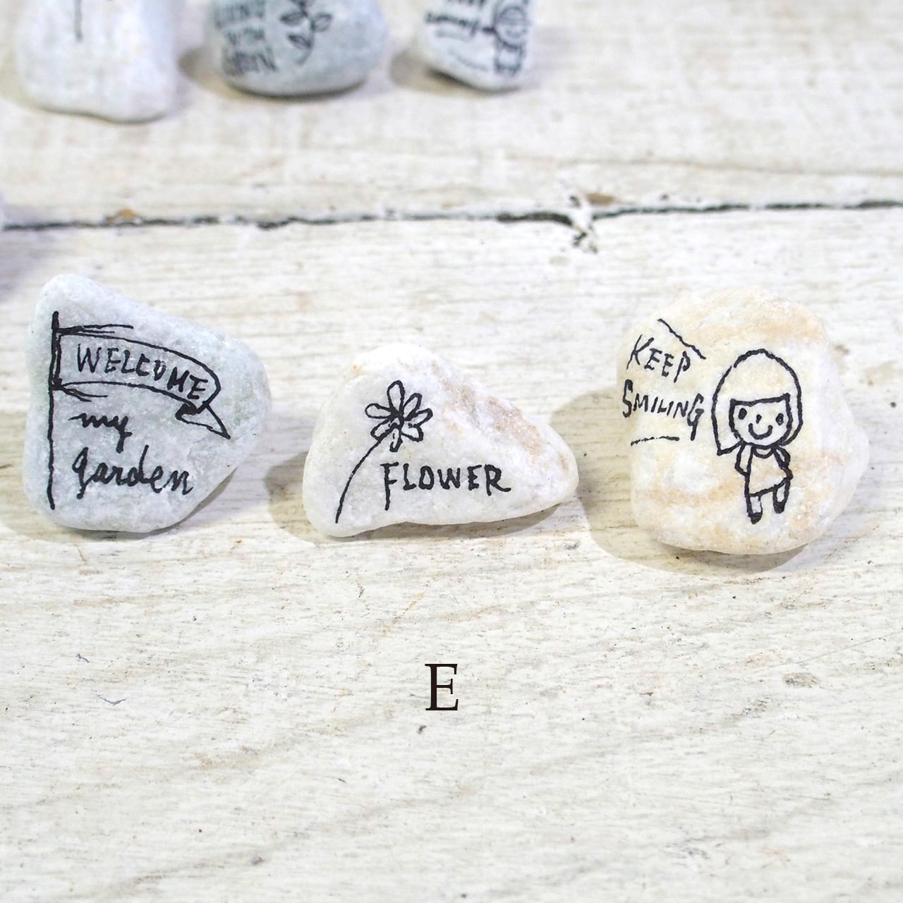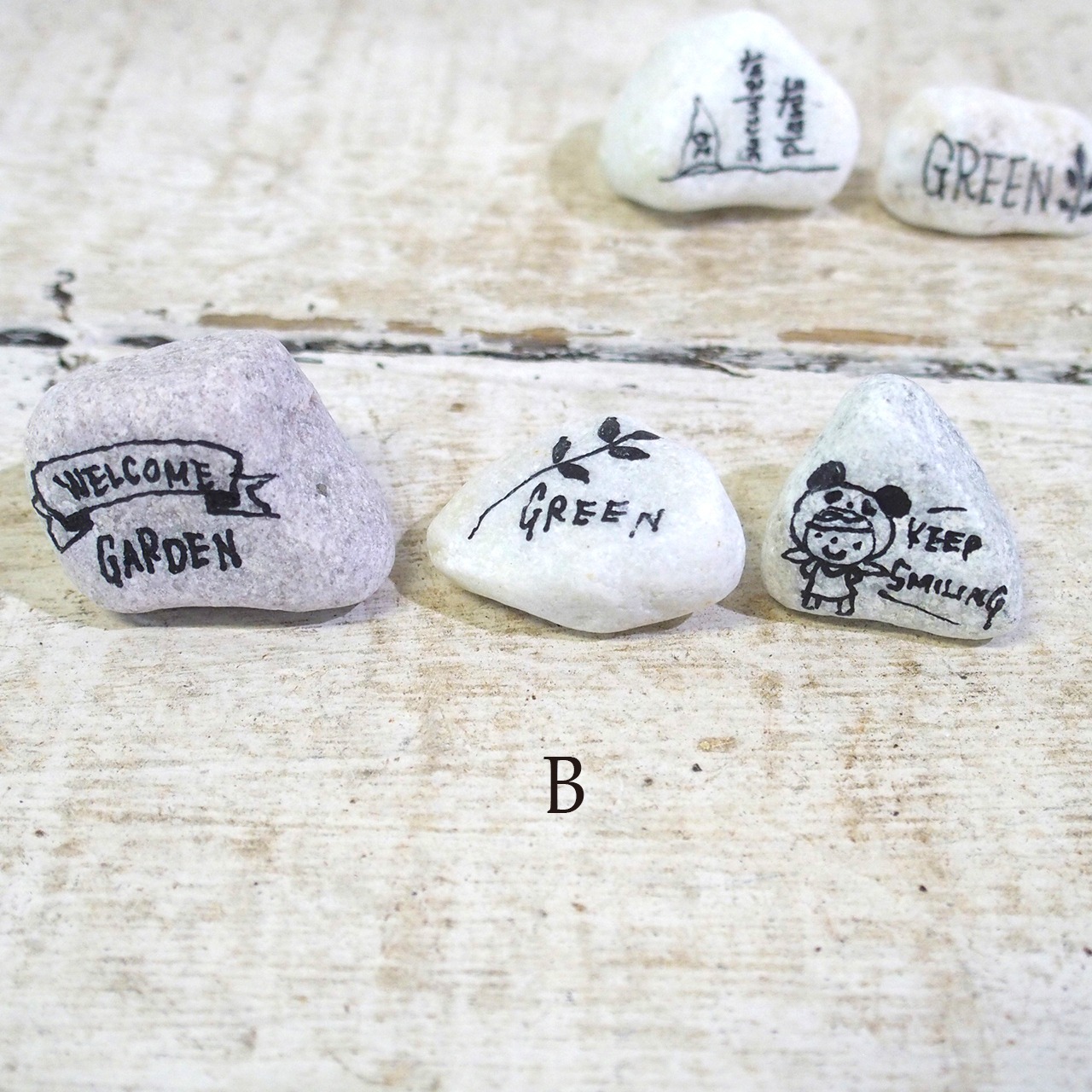 色も形も様々な「小石」に文字やイラストを描いたもの、3個セットでの販売です♪