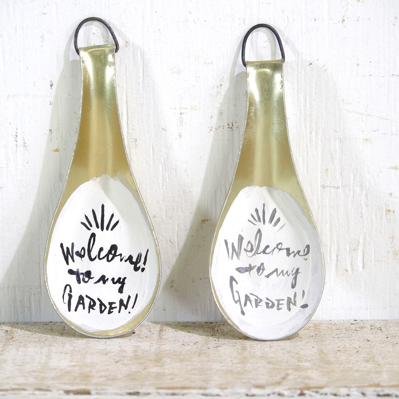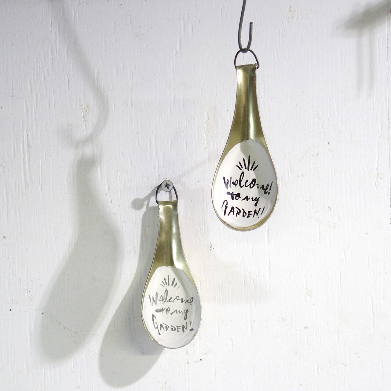 古いアルミのレンゲに文字を入れたガーデンオーナメントです。
