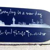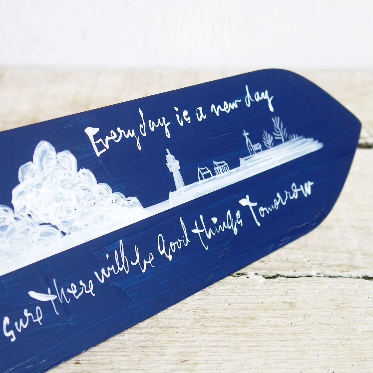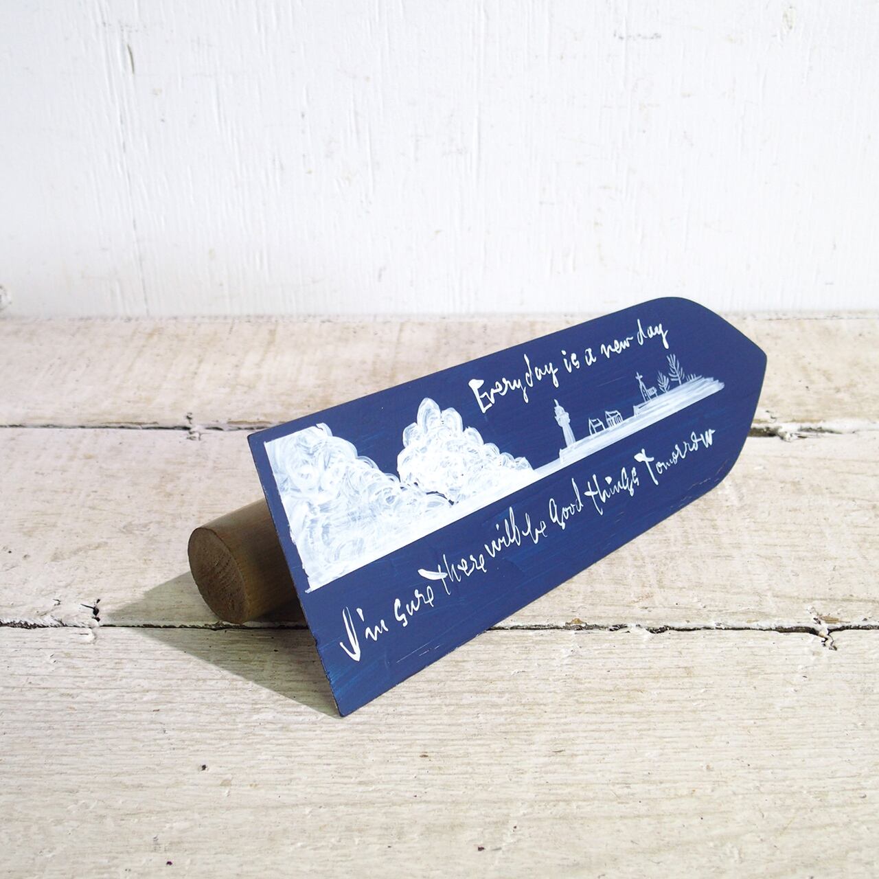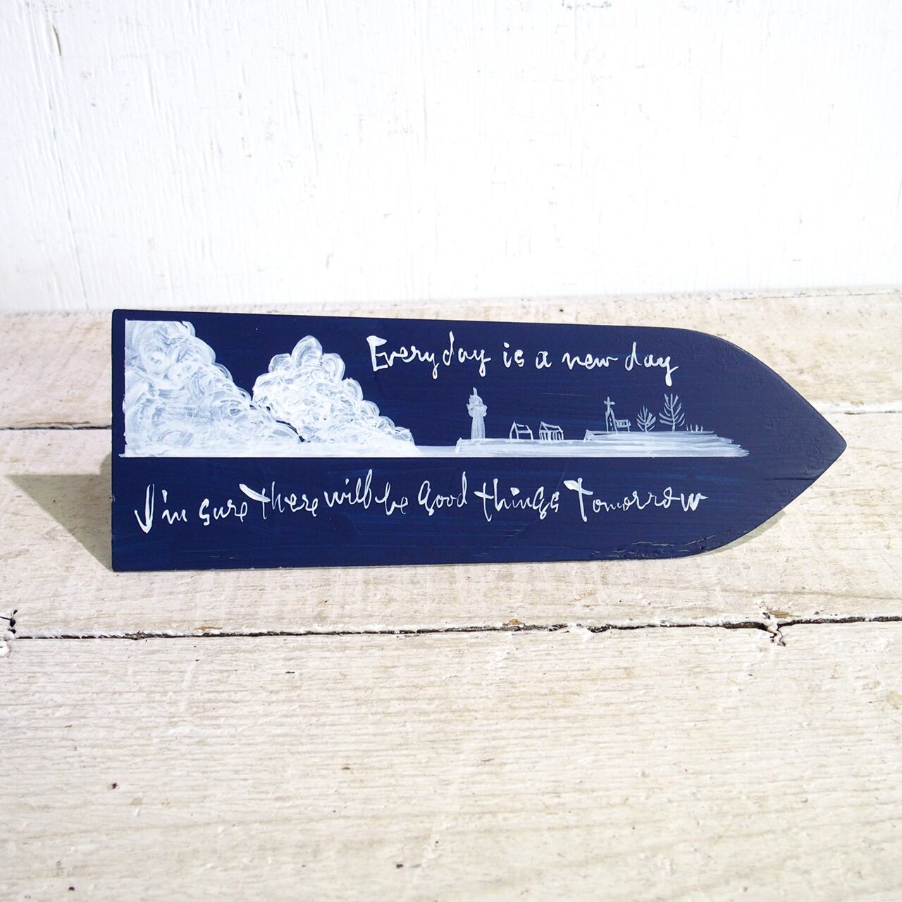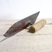 左官職人の使うコテにイラストと文字を入れたサインです。