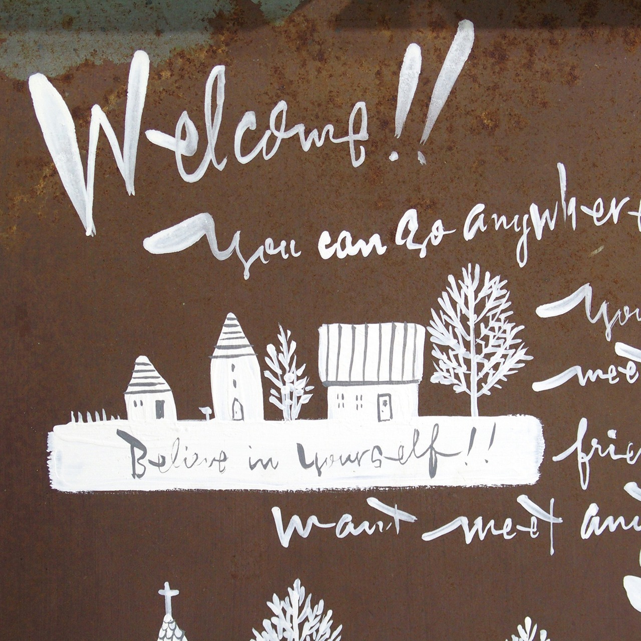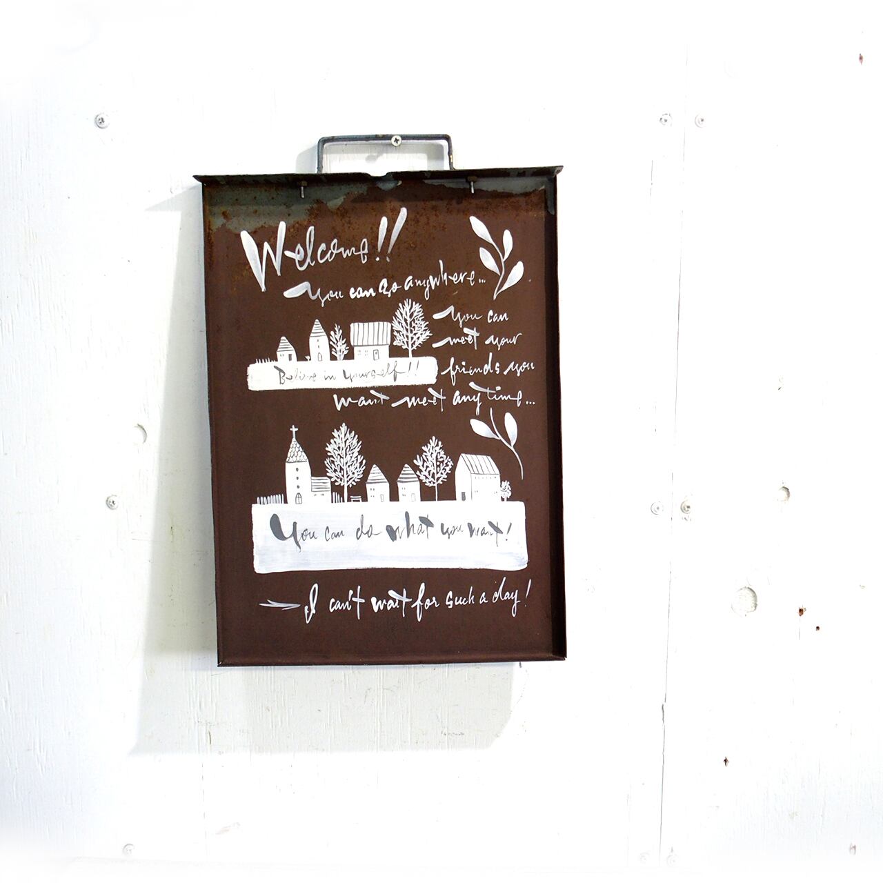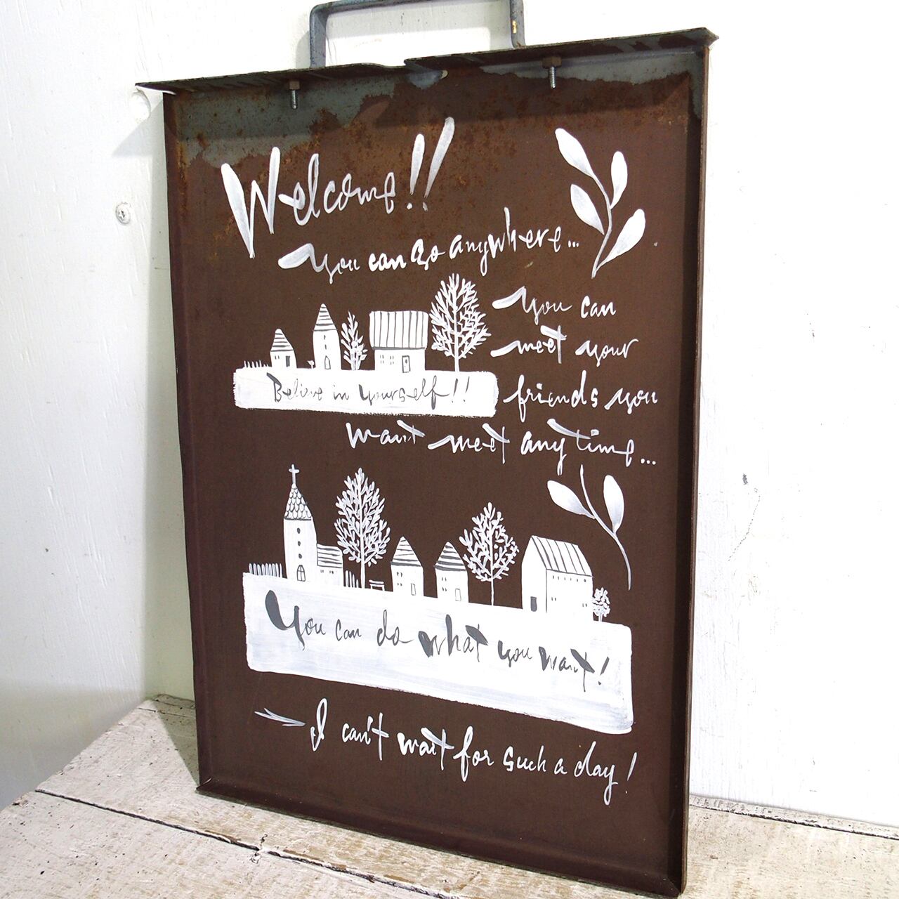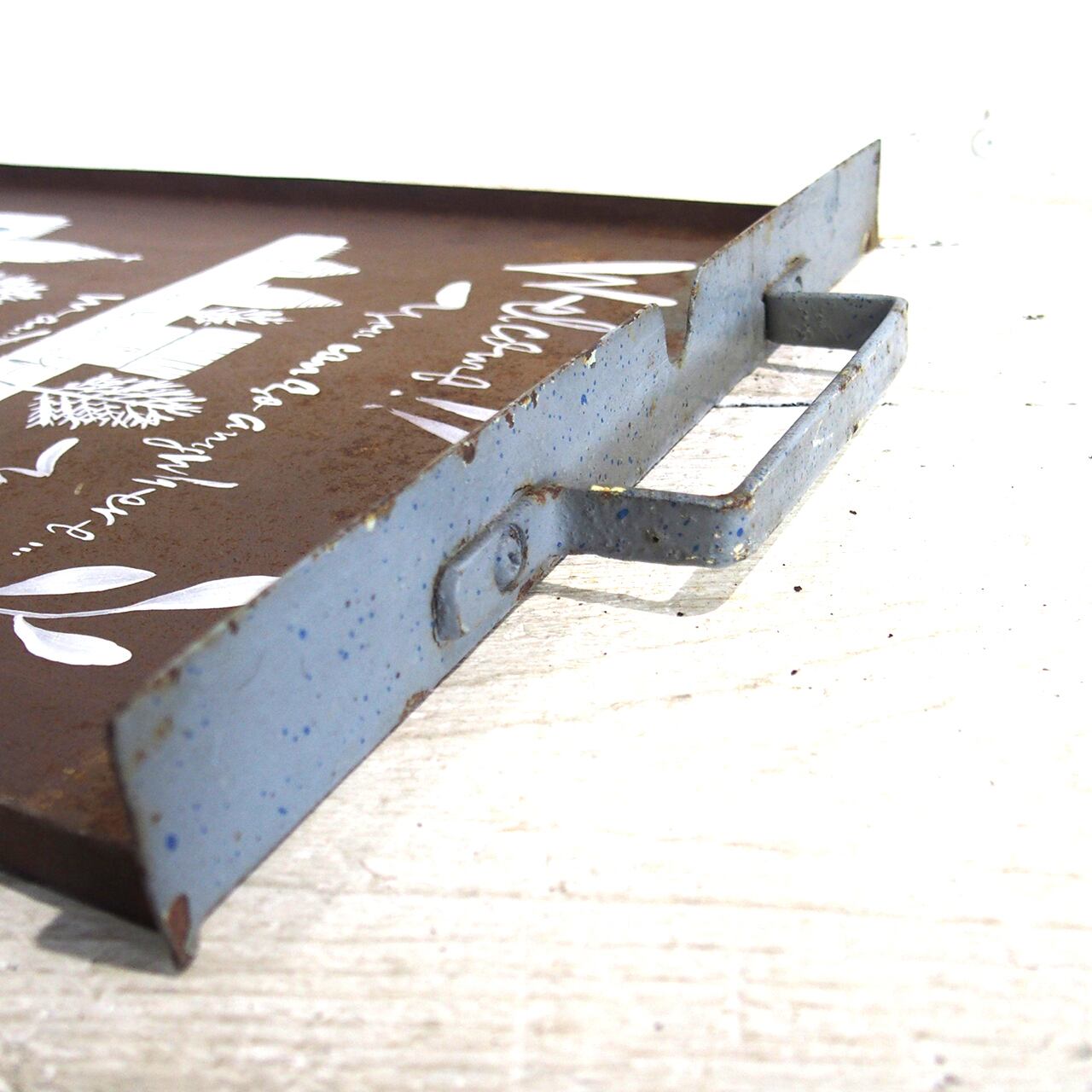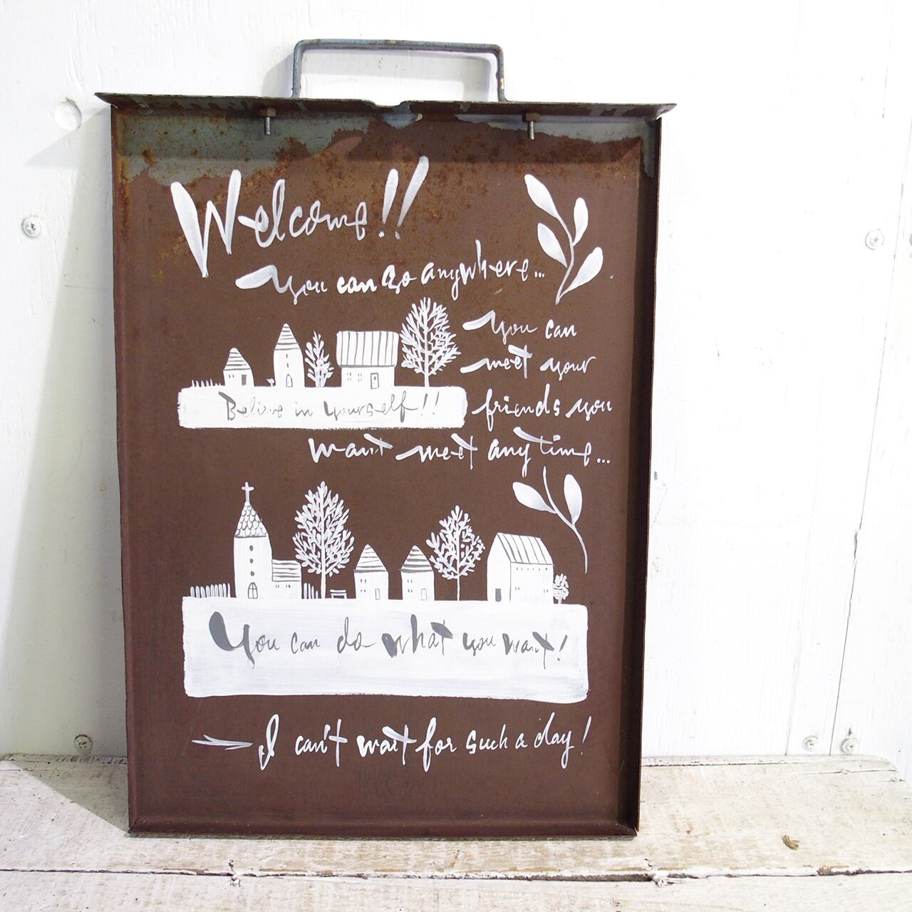 錆びた鉄の引き出しにイラストを入れたガーデンサインです♪