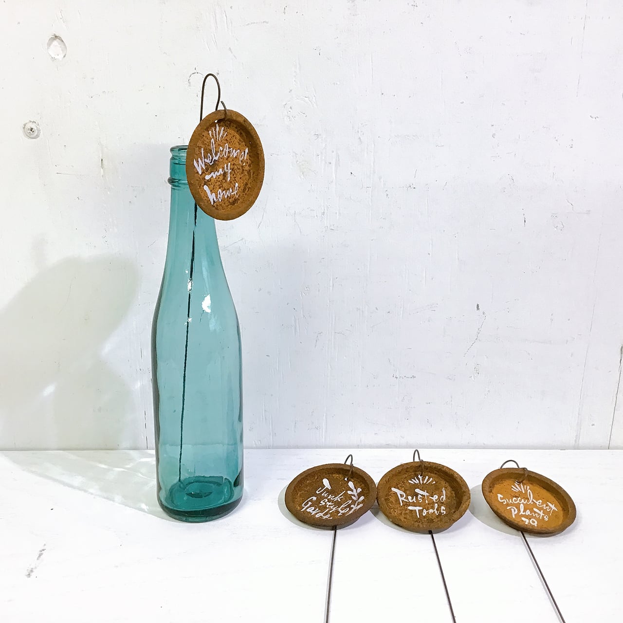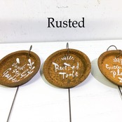 丸くてサビサビの缶の蓋に文字を入れたサイン。