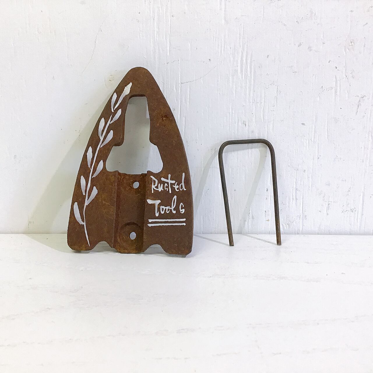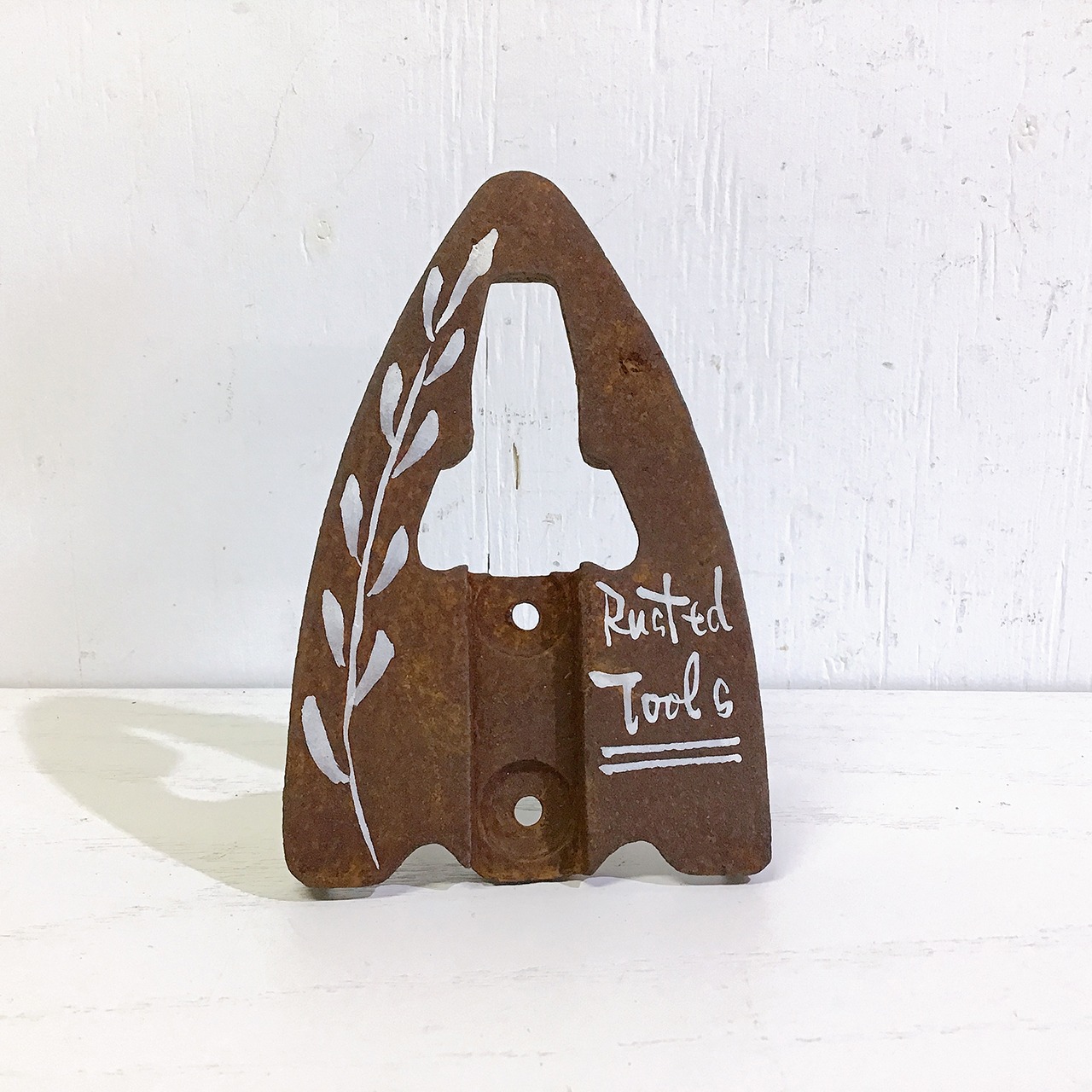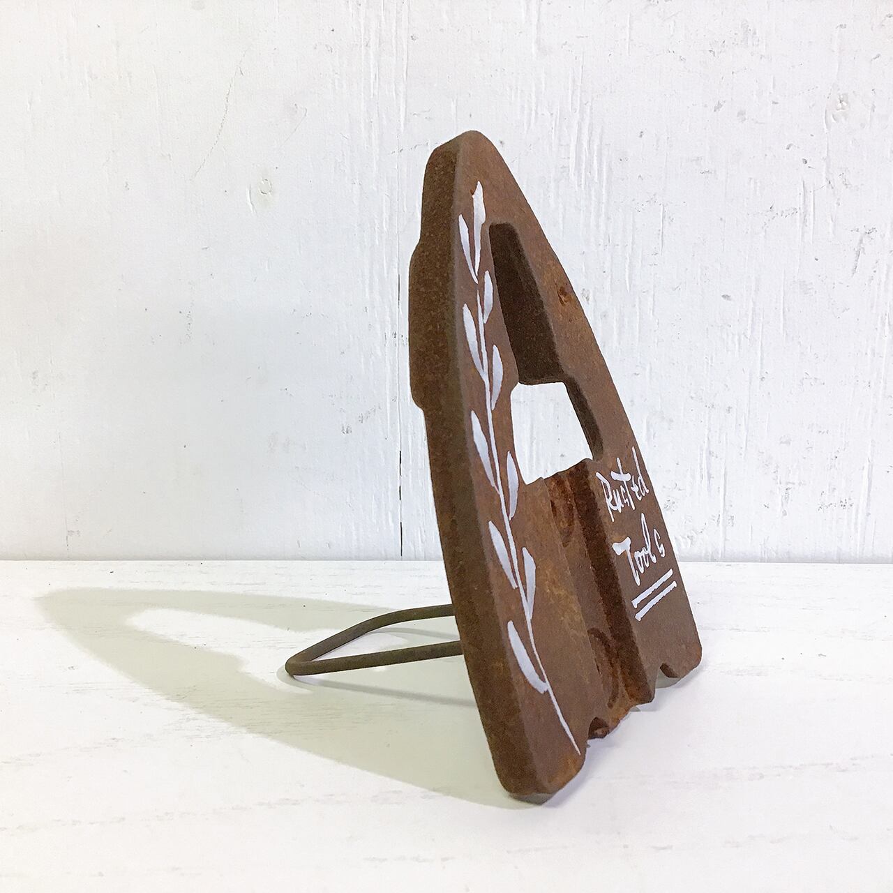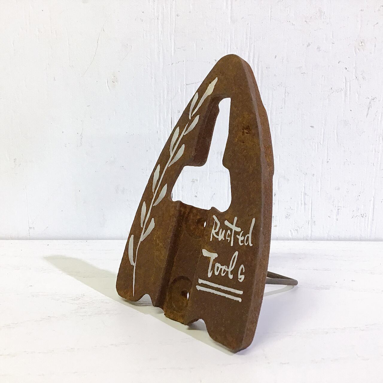 サビサビの古いアイロンに文字を入れたガーデンサインです。
