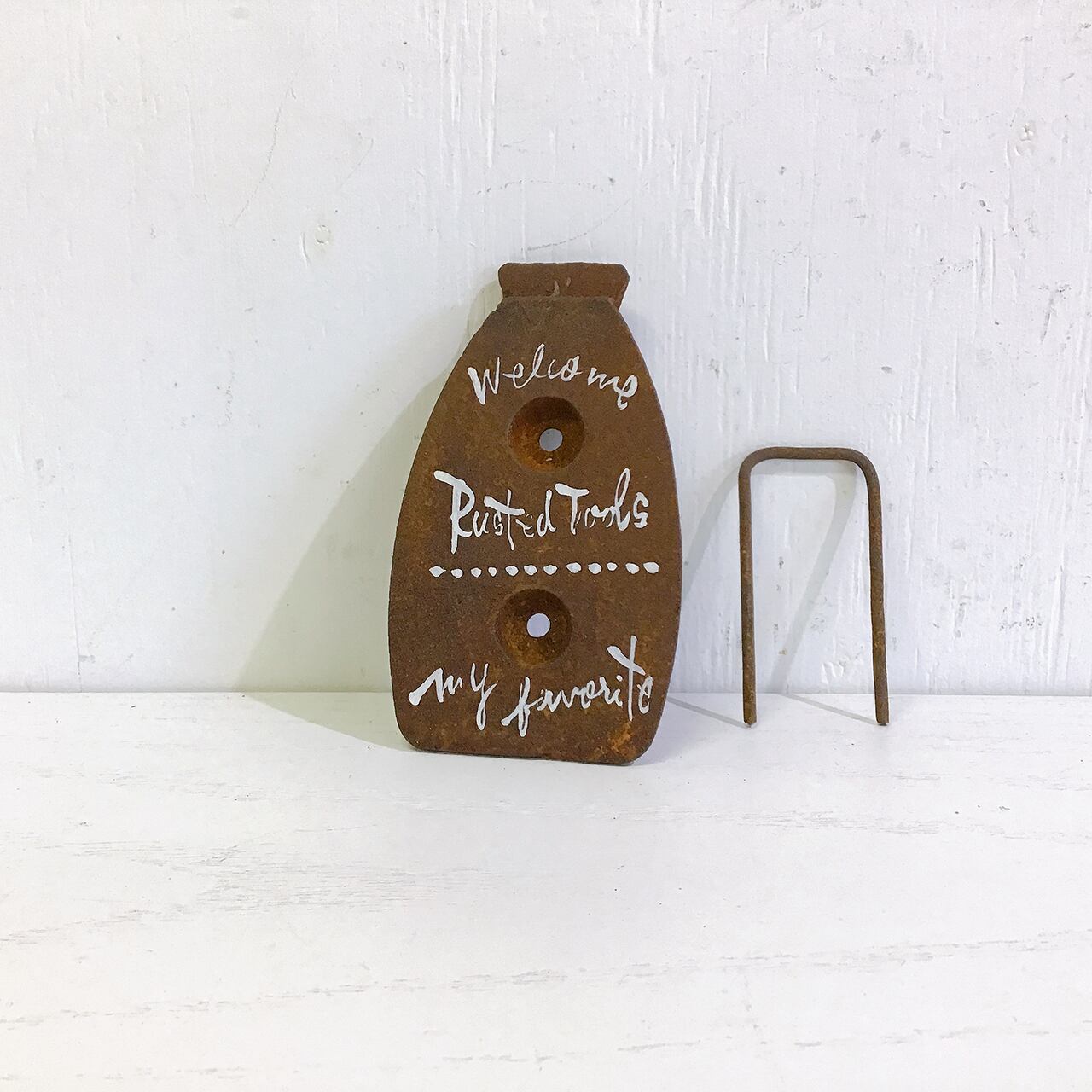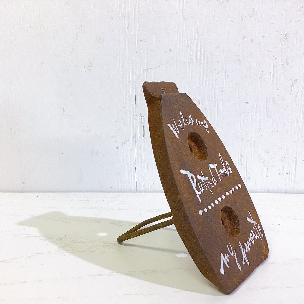 サビサビの古いアイロンに文字を入れたガーデンサインです。