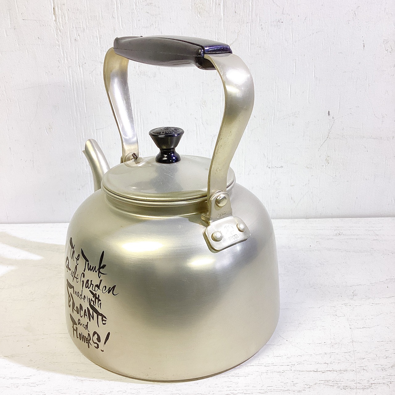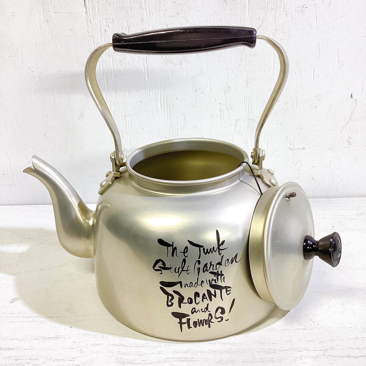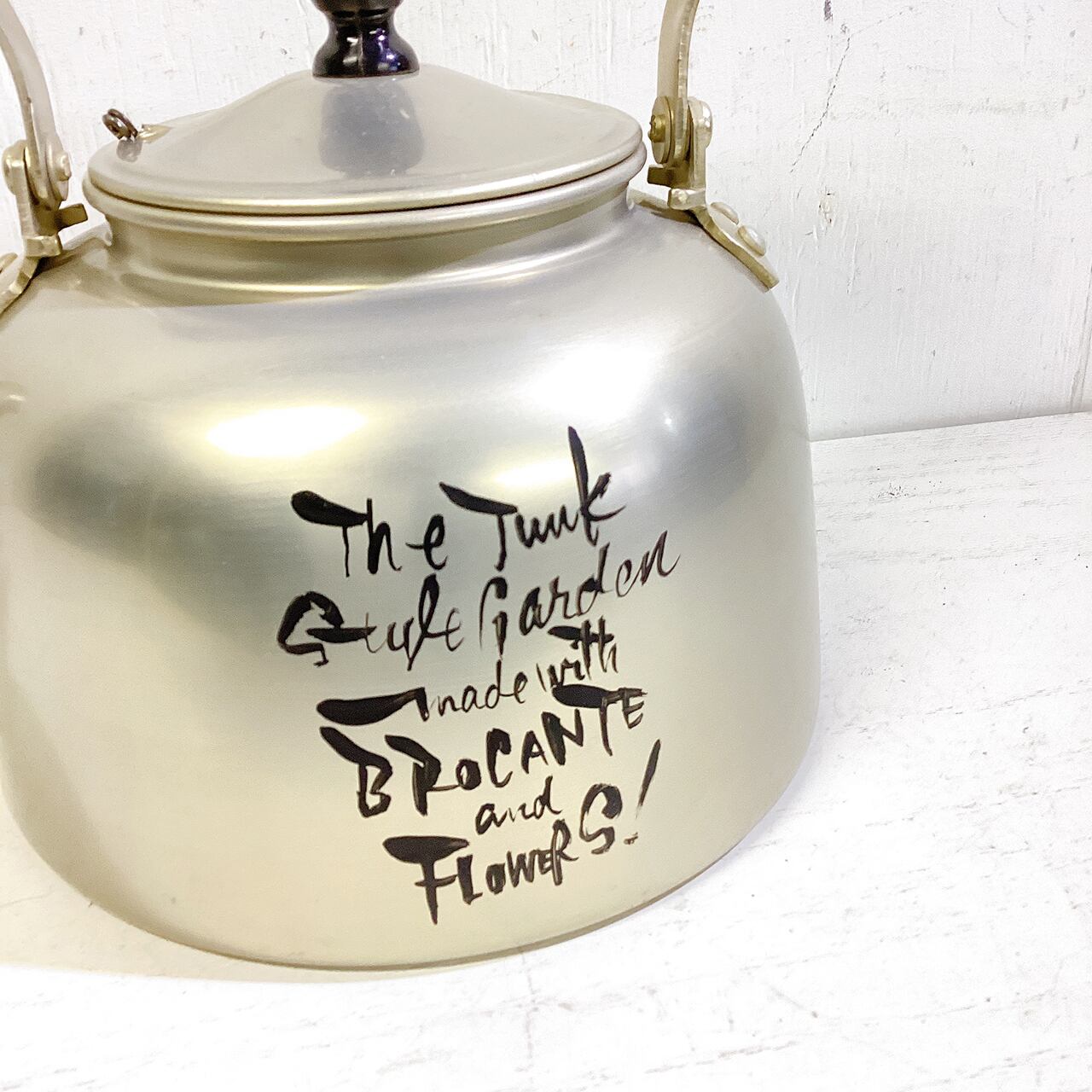 レトロなアルマイトのヤカンに文字を入れたプランターです♪