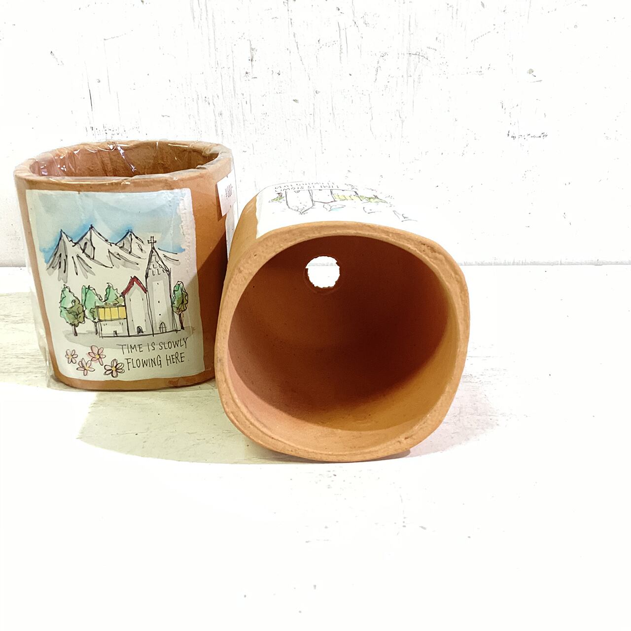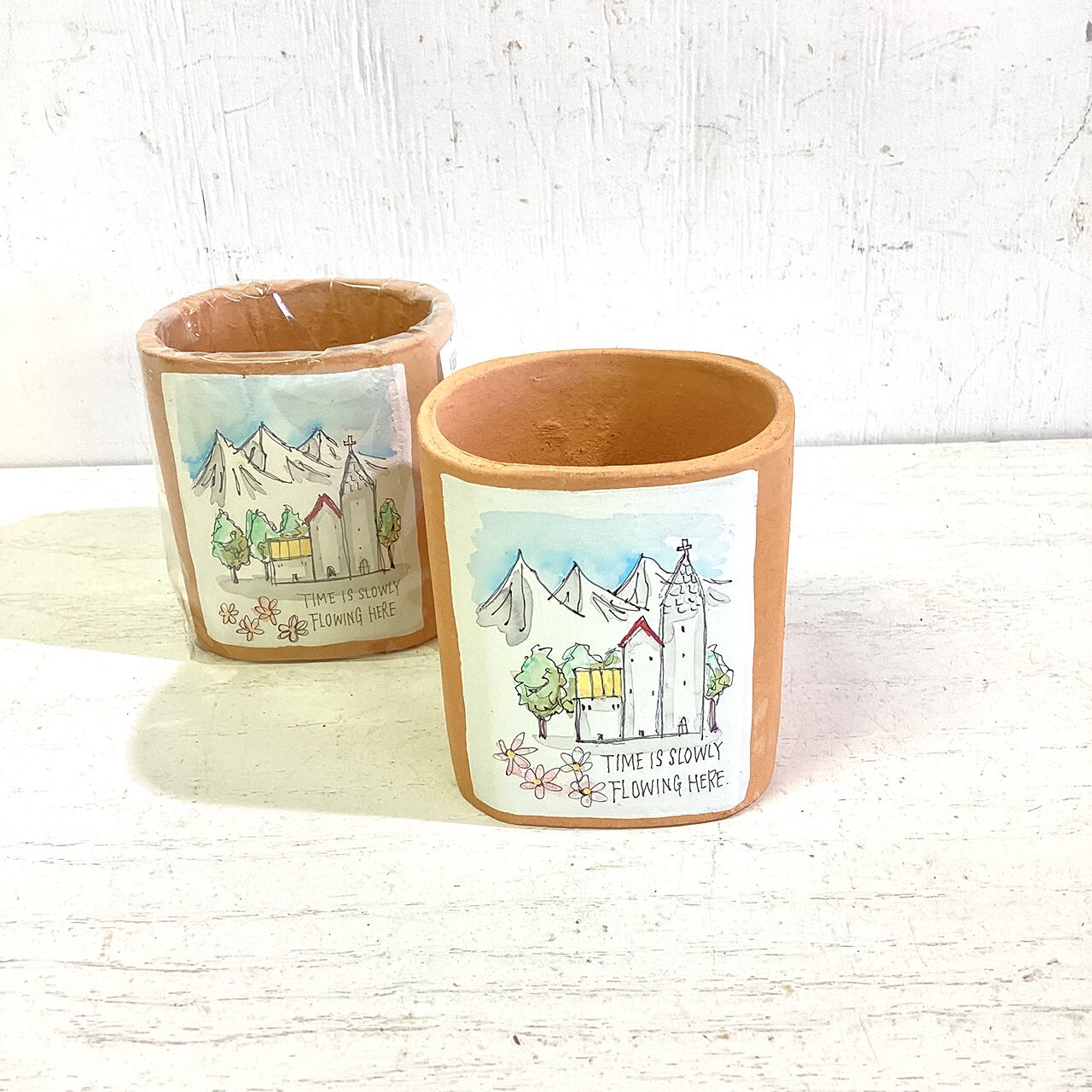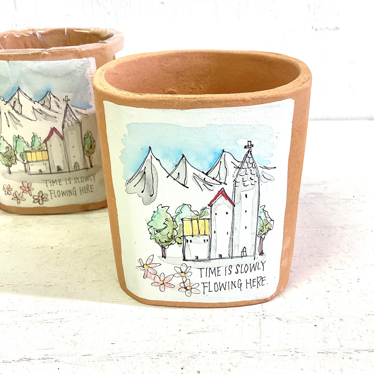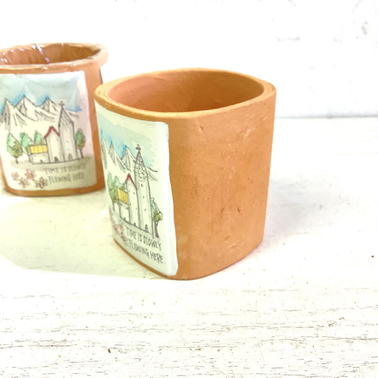 【リメイク鉢】四角2.5号 教会のある風景 水彩風