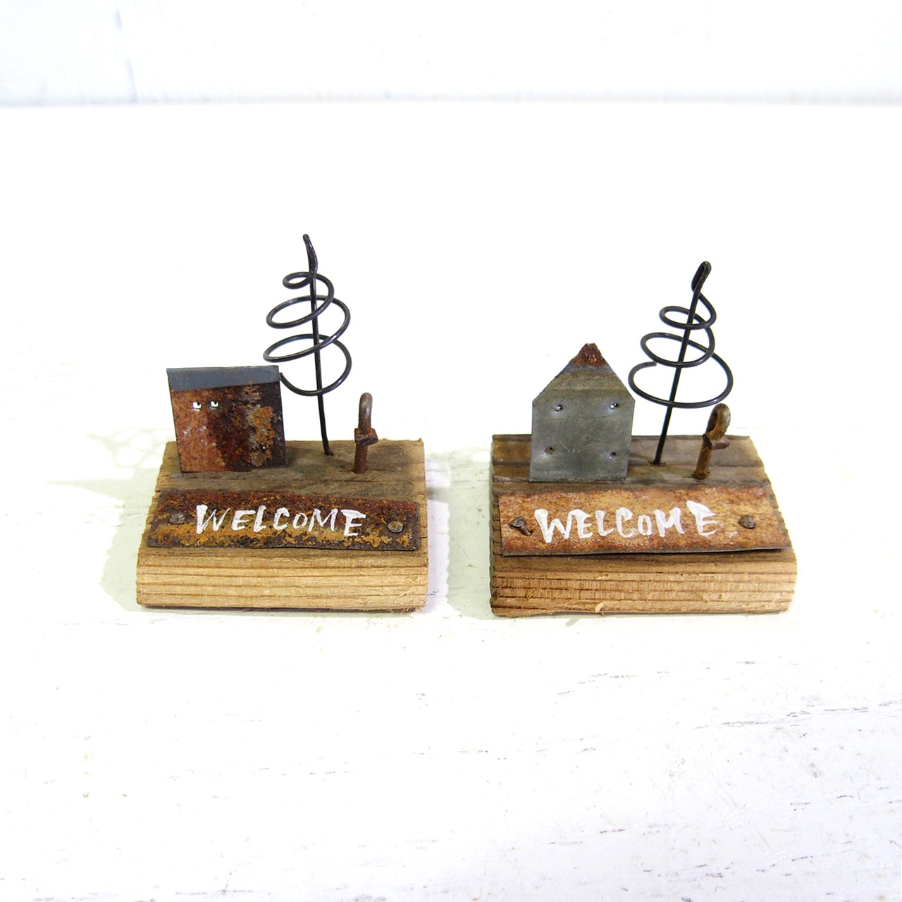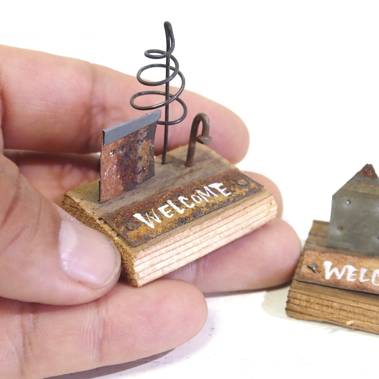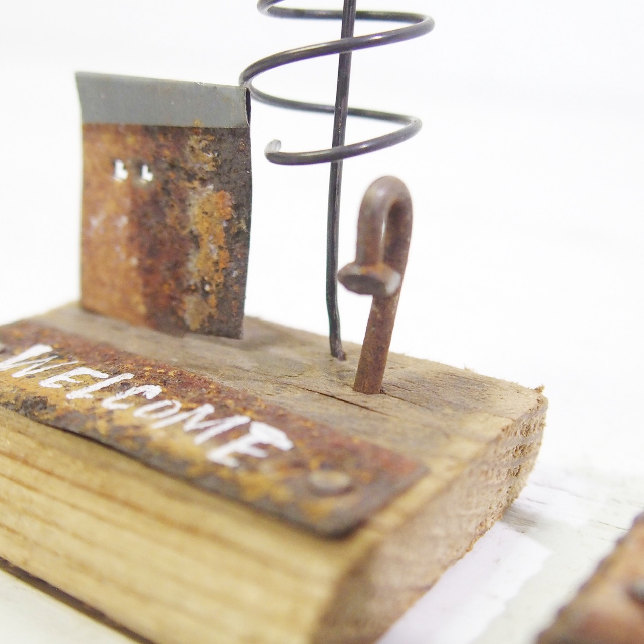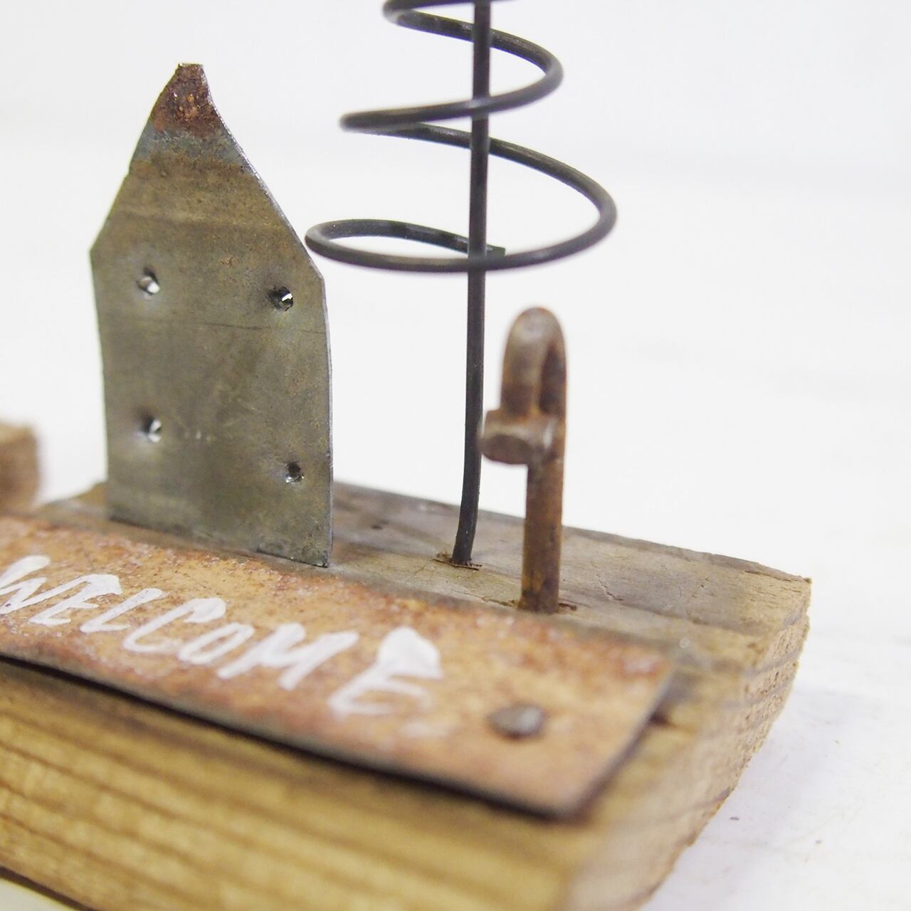 サビサビのブリキのお家を古材に差し込んだオブジェです♪