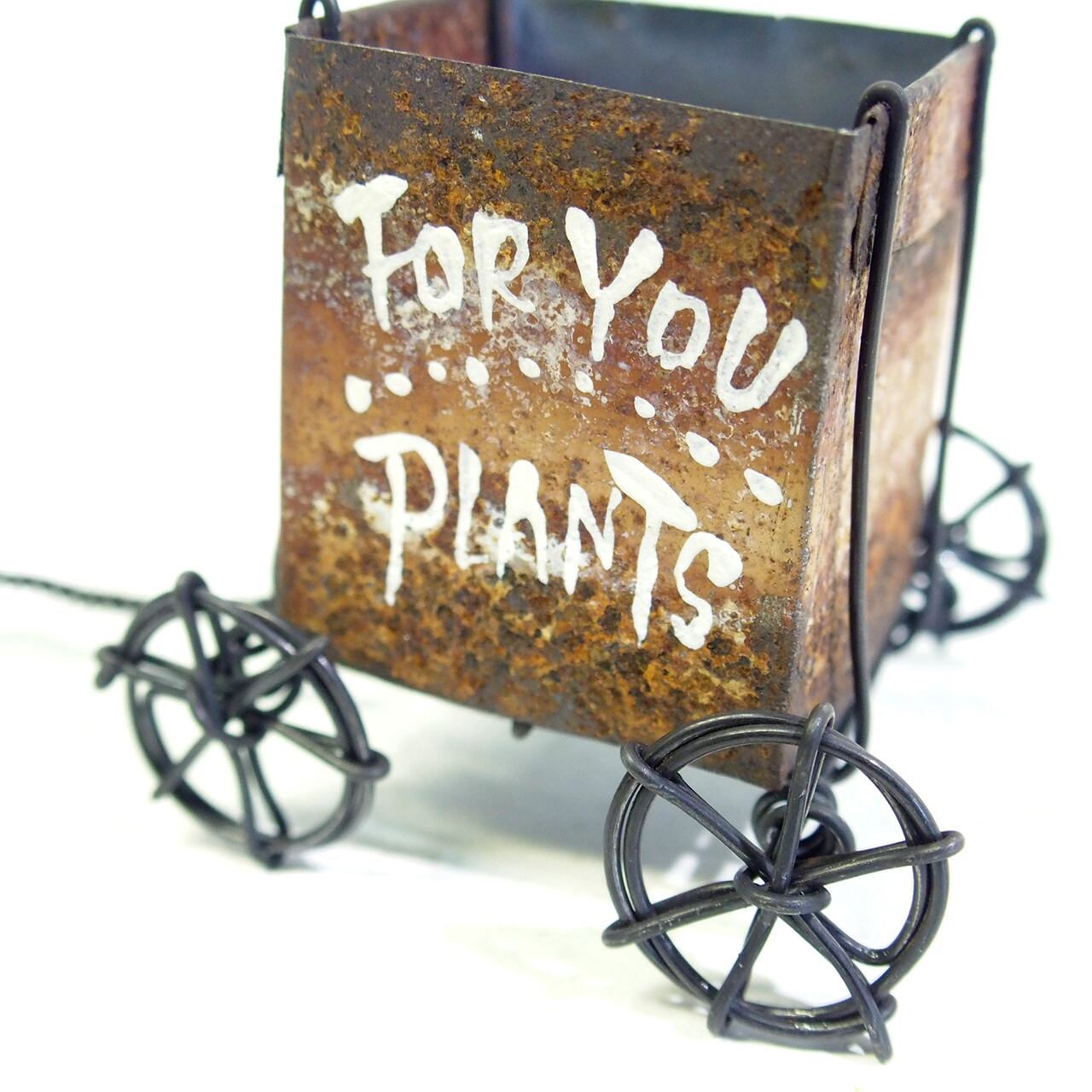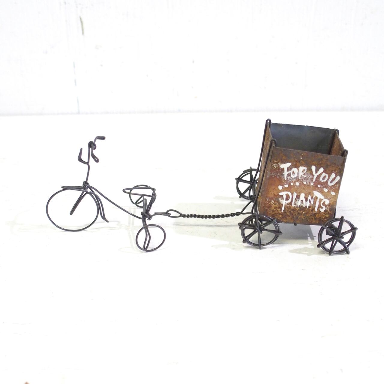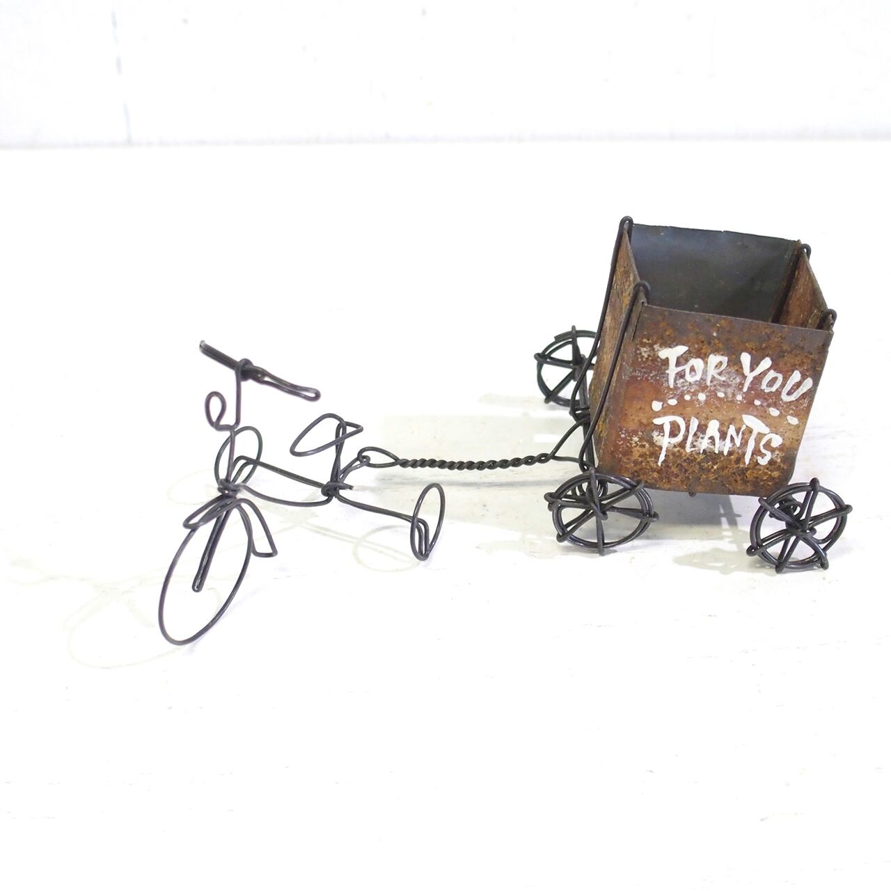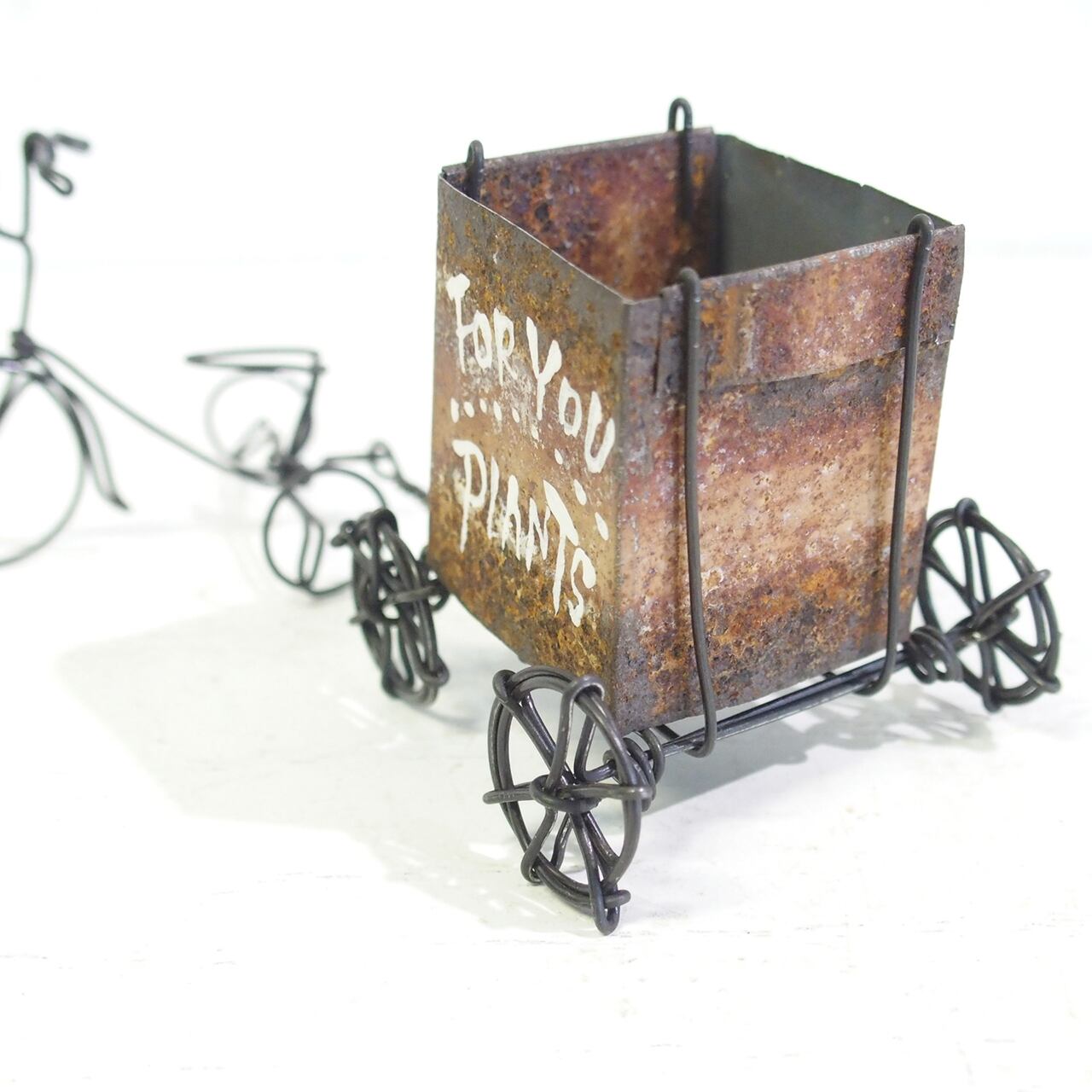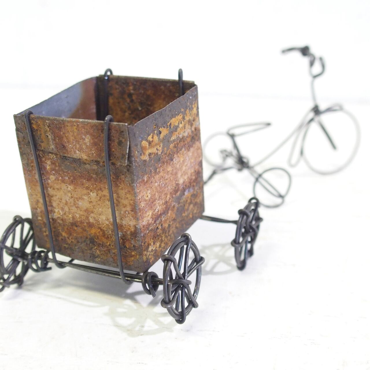 ワイヤーワークの三輪車にサビサビブリキで作ったBOXリアカーを繋いで♪