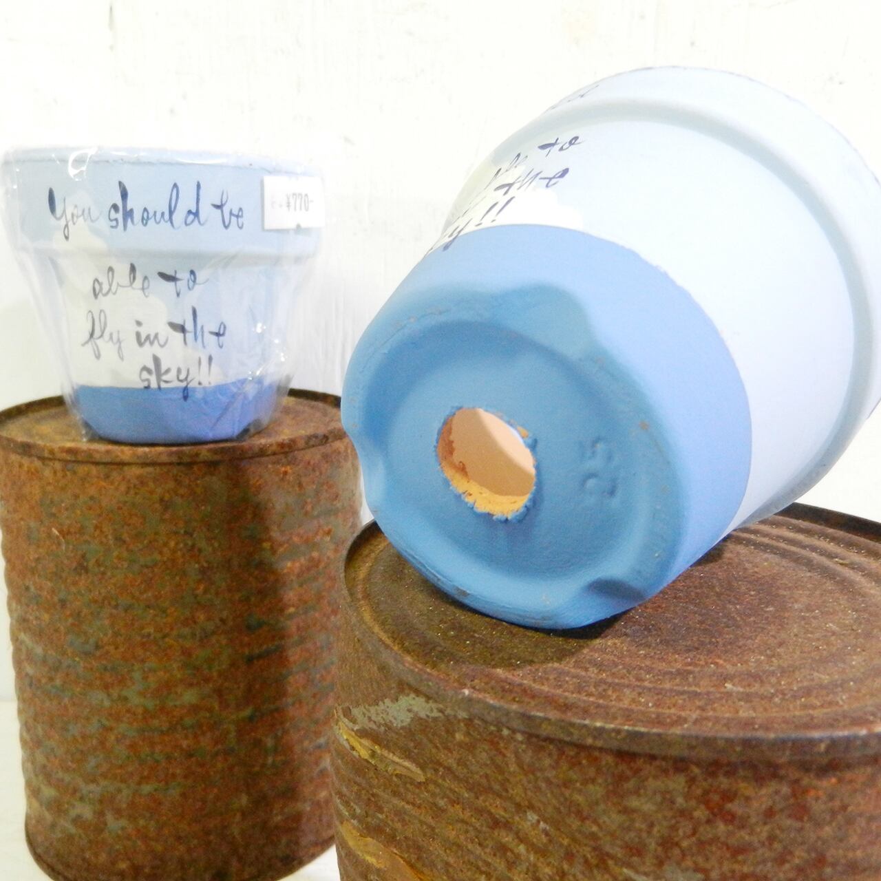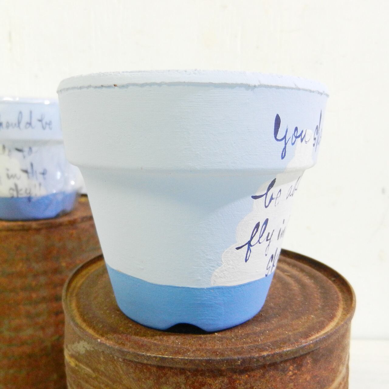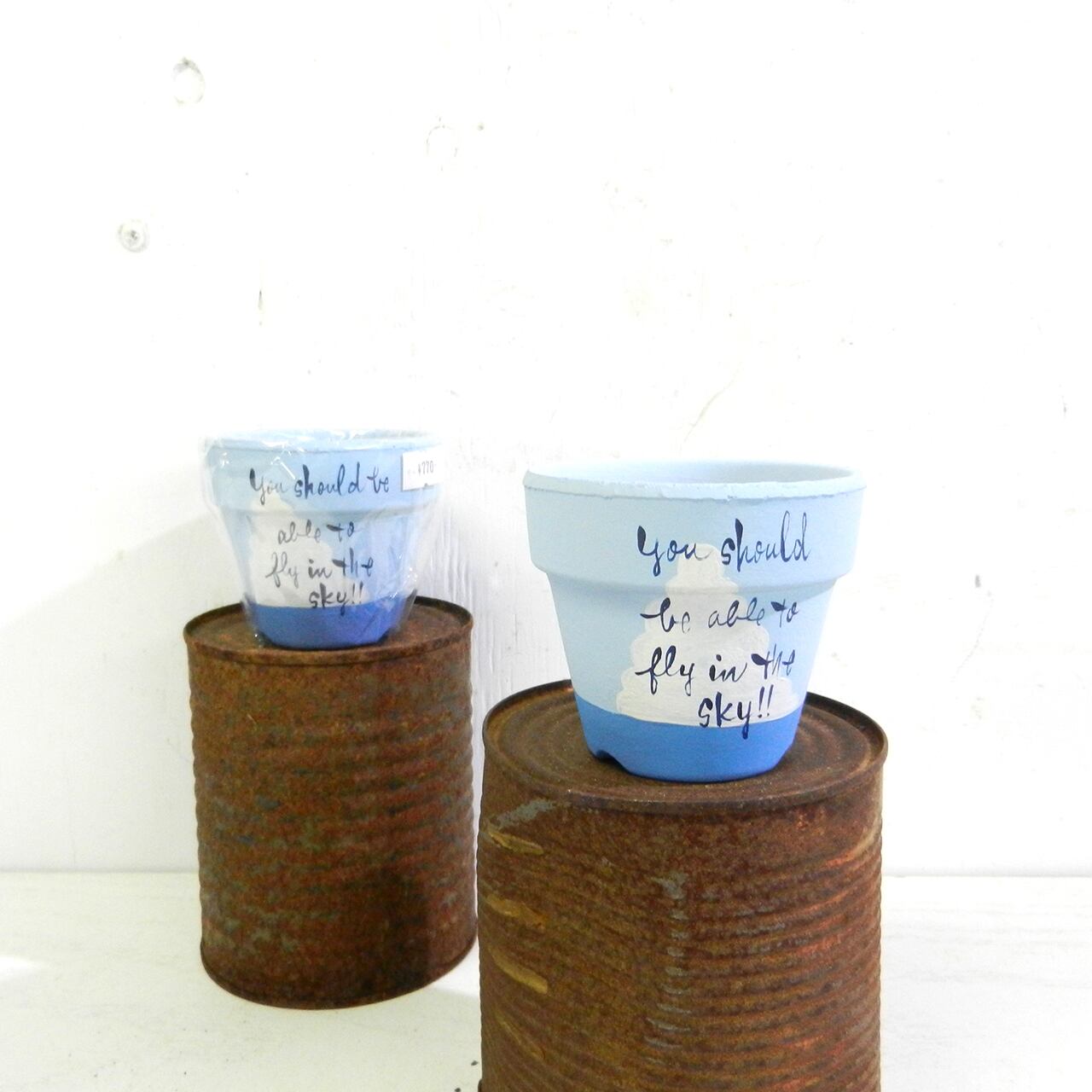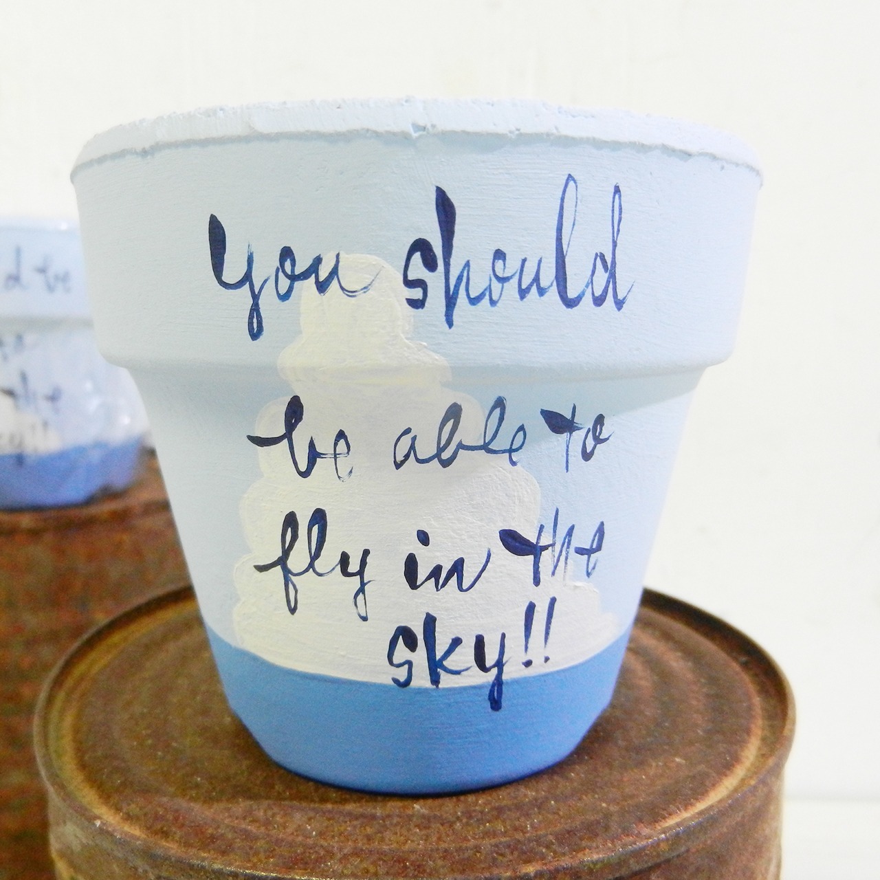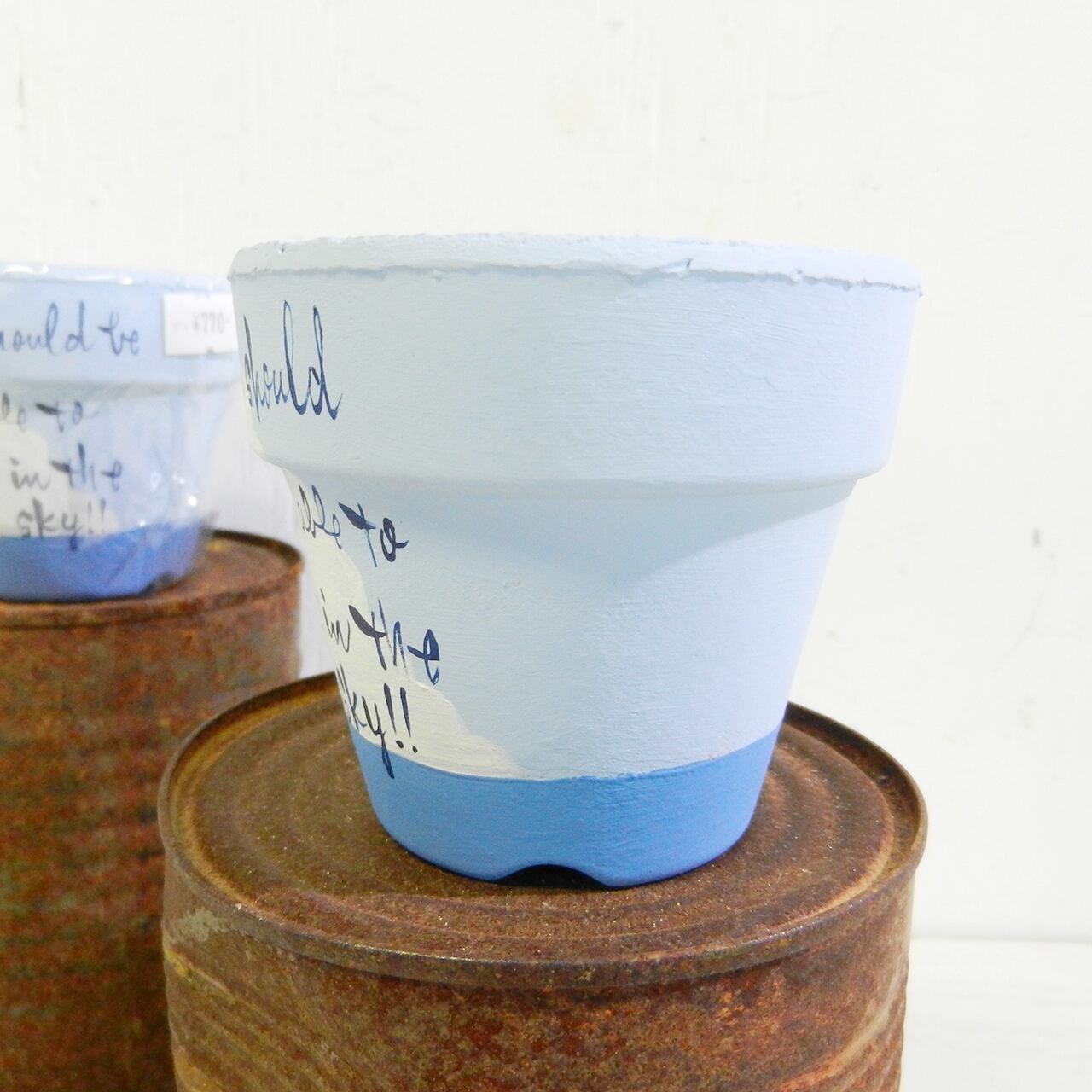 夏らしい海と雲のイラストに文字を入れたリメ鉢です♪