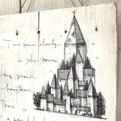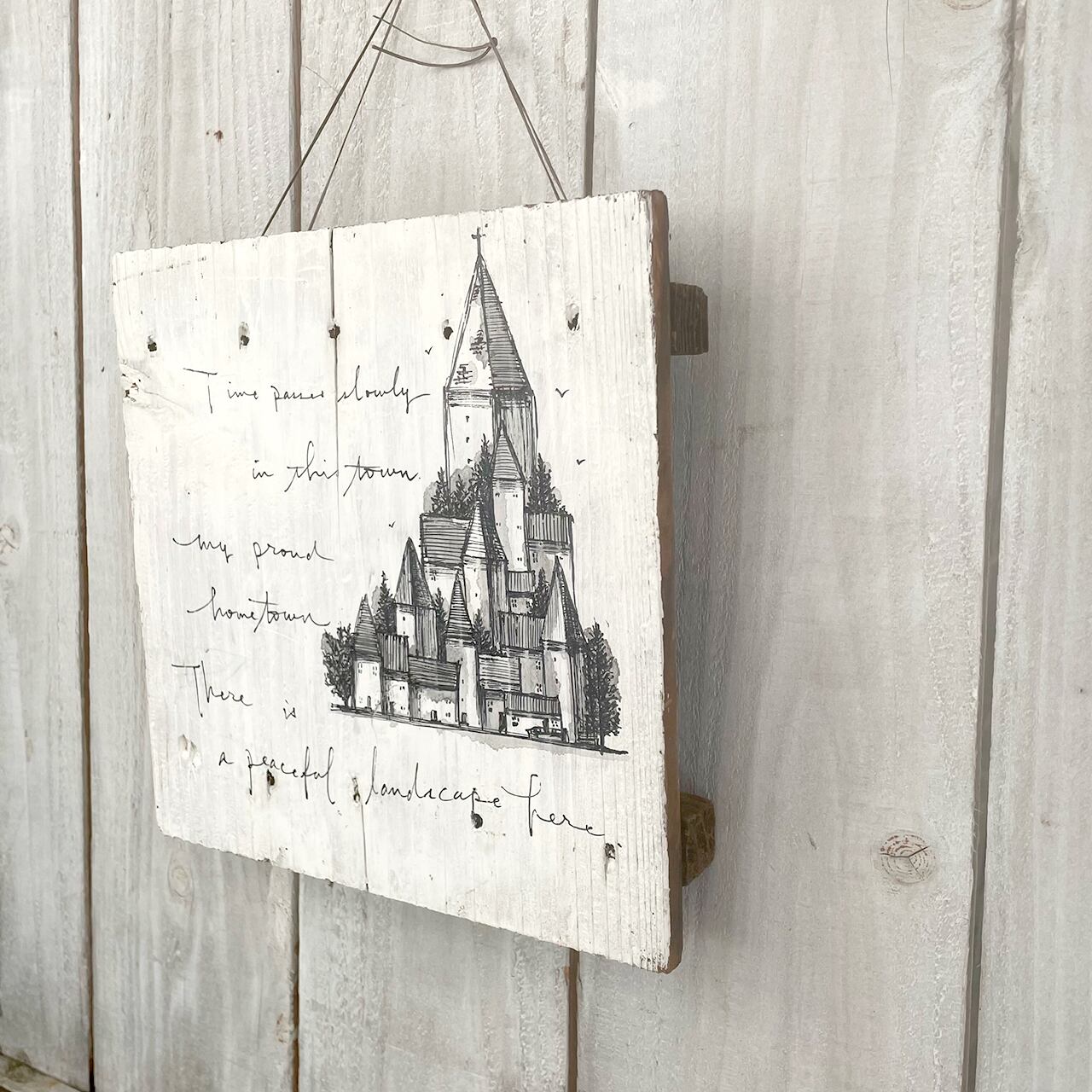 教会を囲む町並みのイラスト、モノクロバージョン。