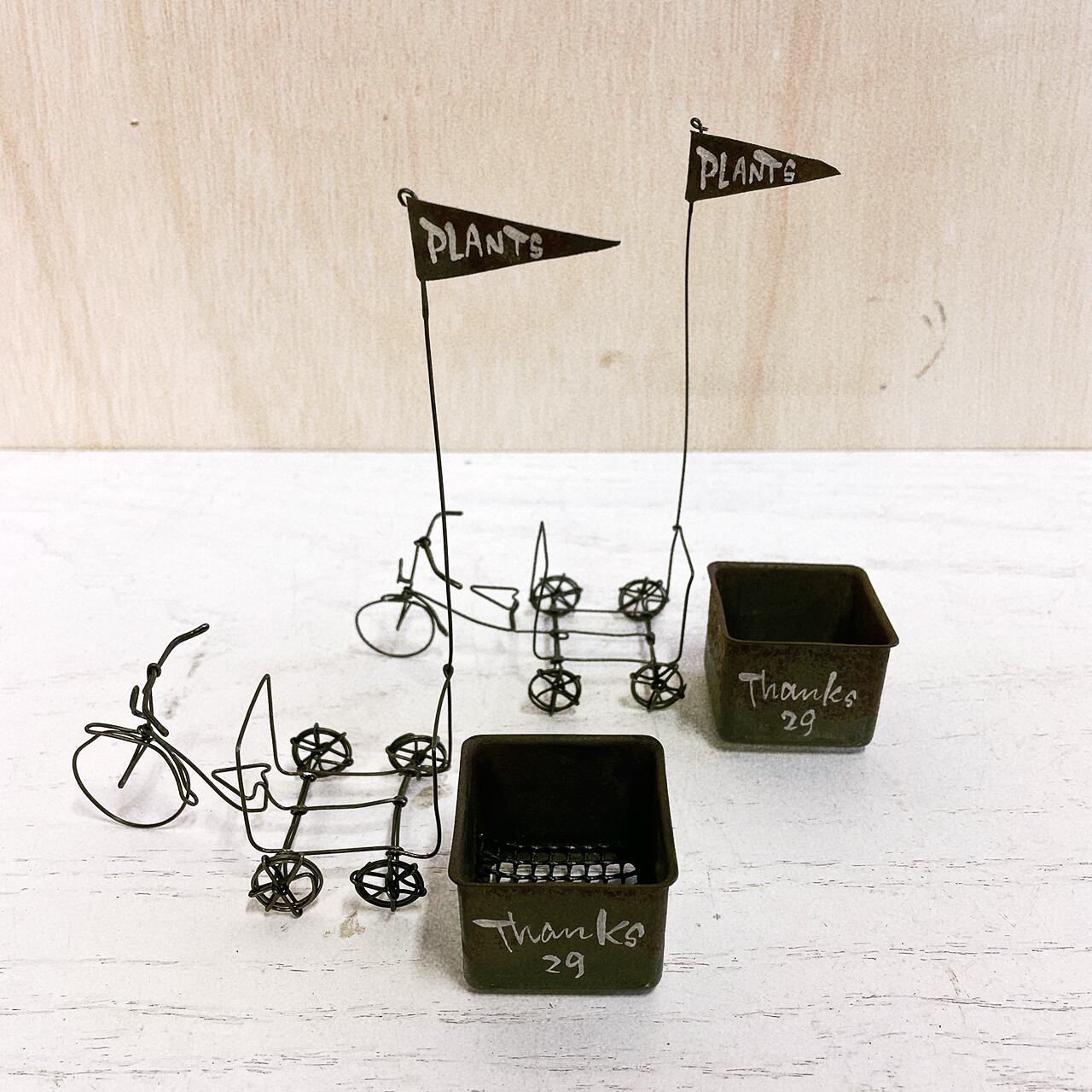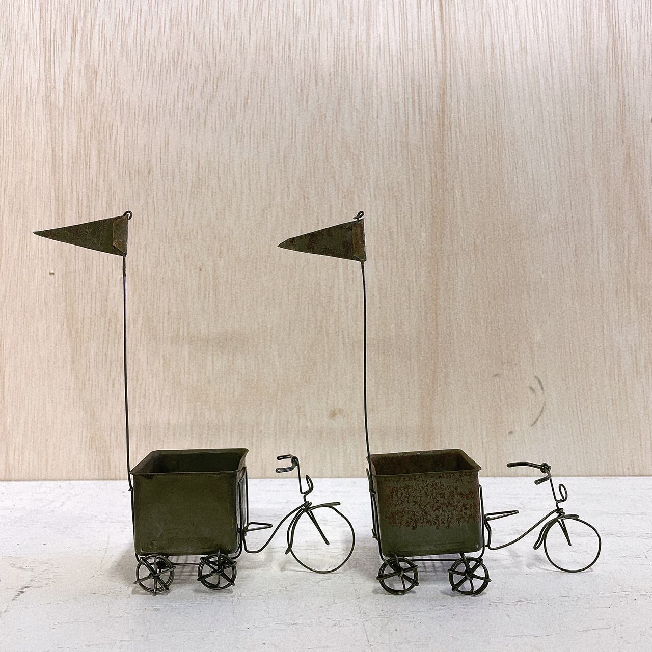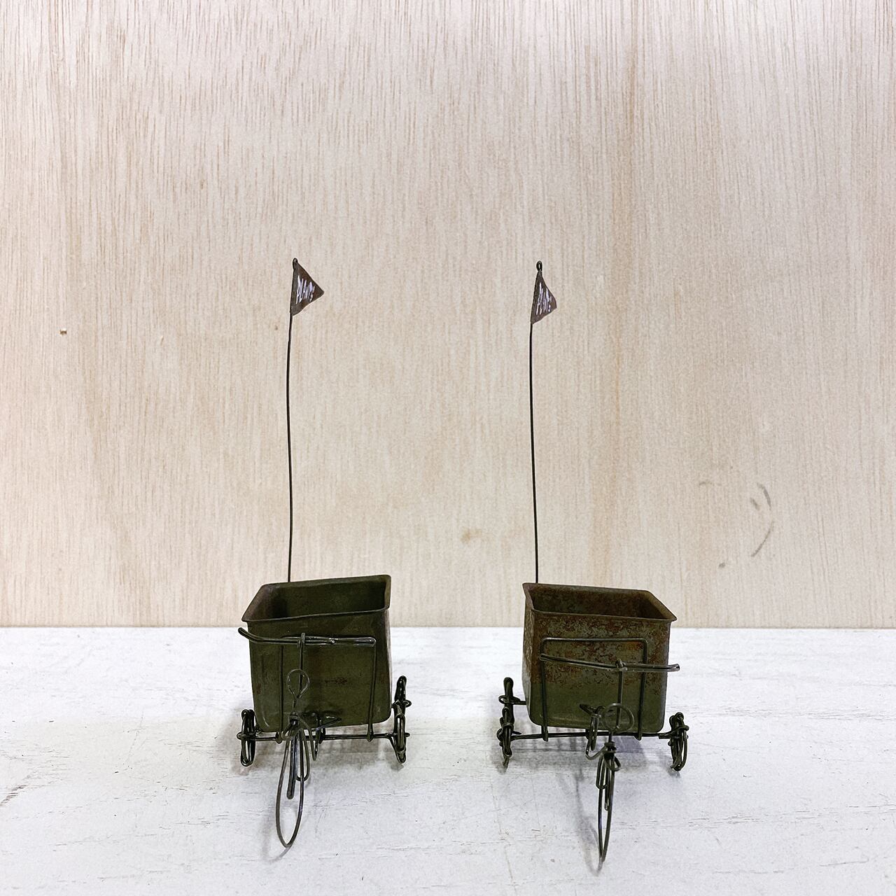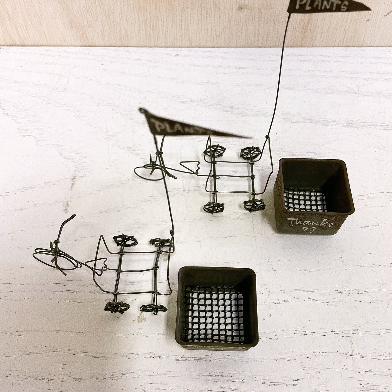ワイヤーで作った五輪車に菓子型のBOXを付けたミニミニプランターです♪