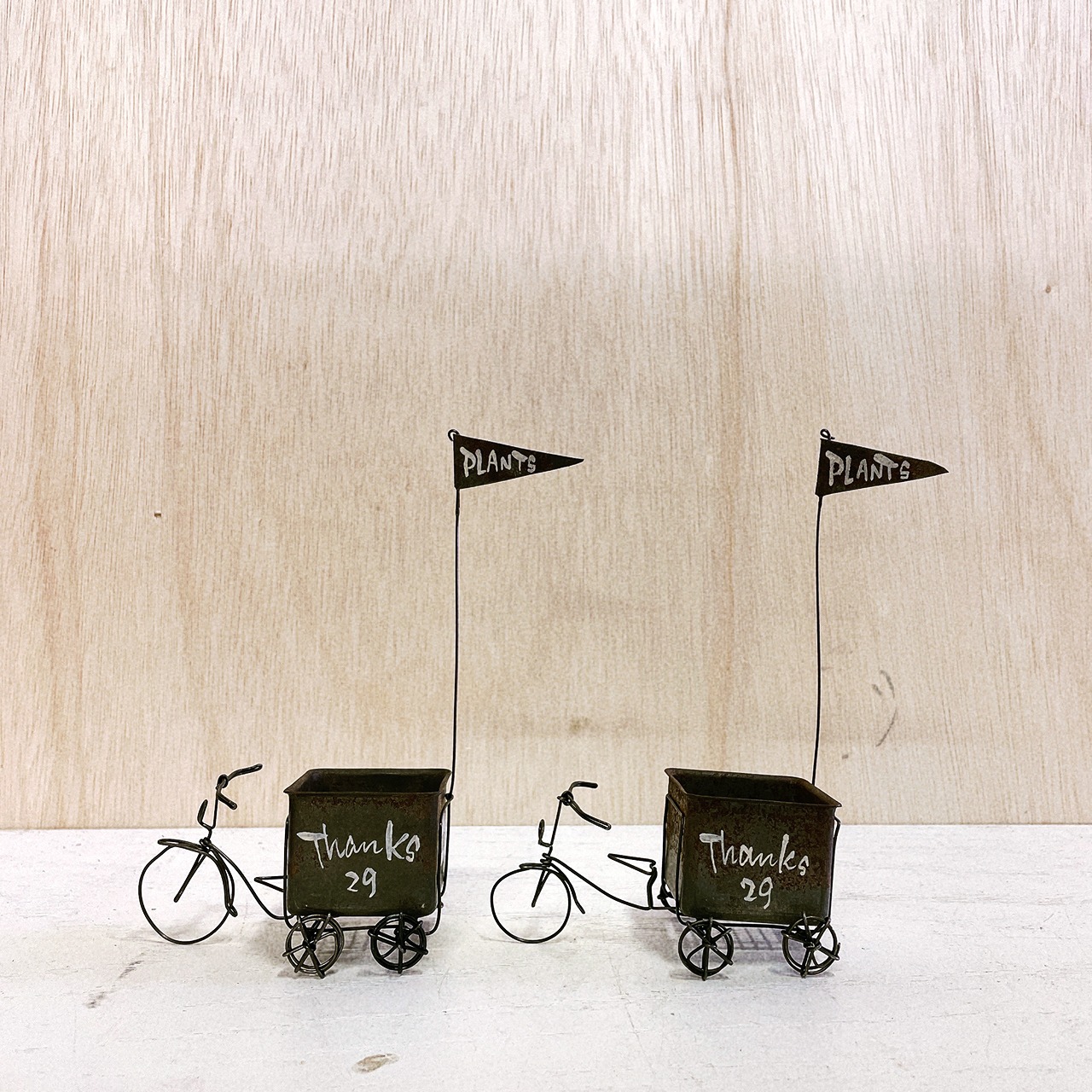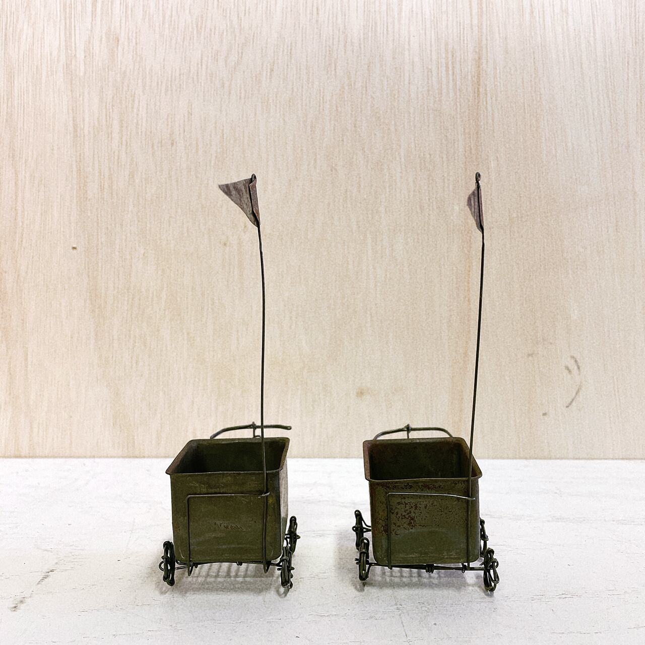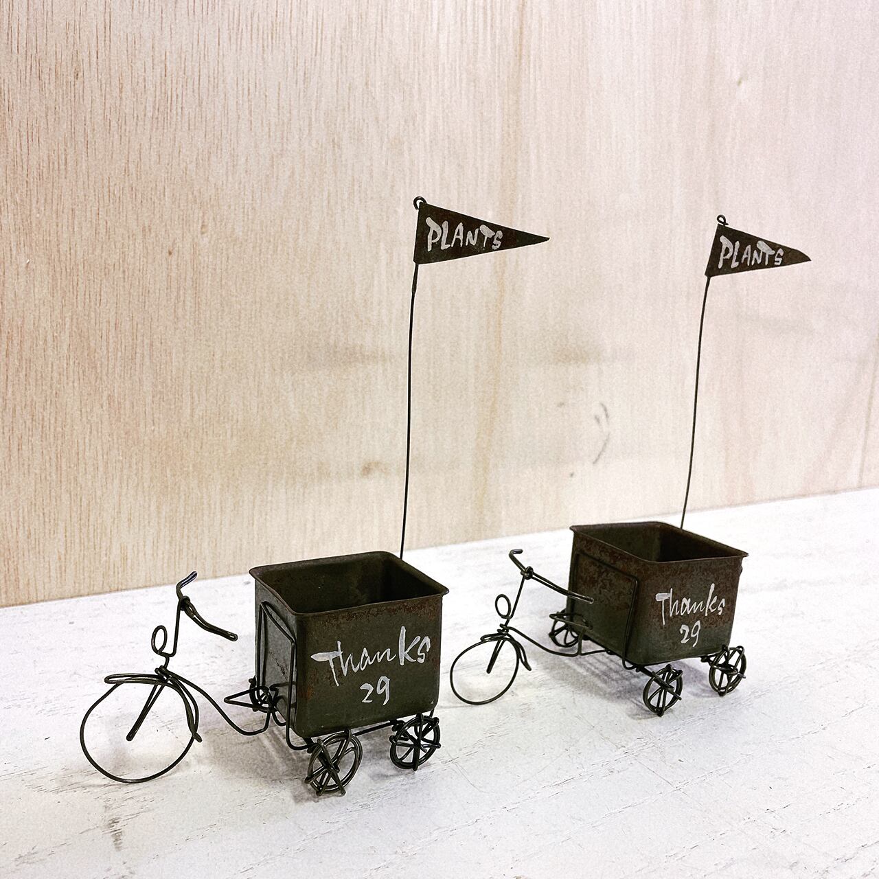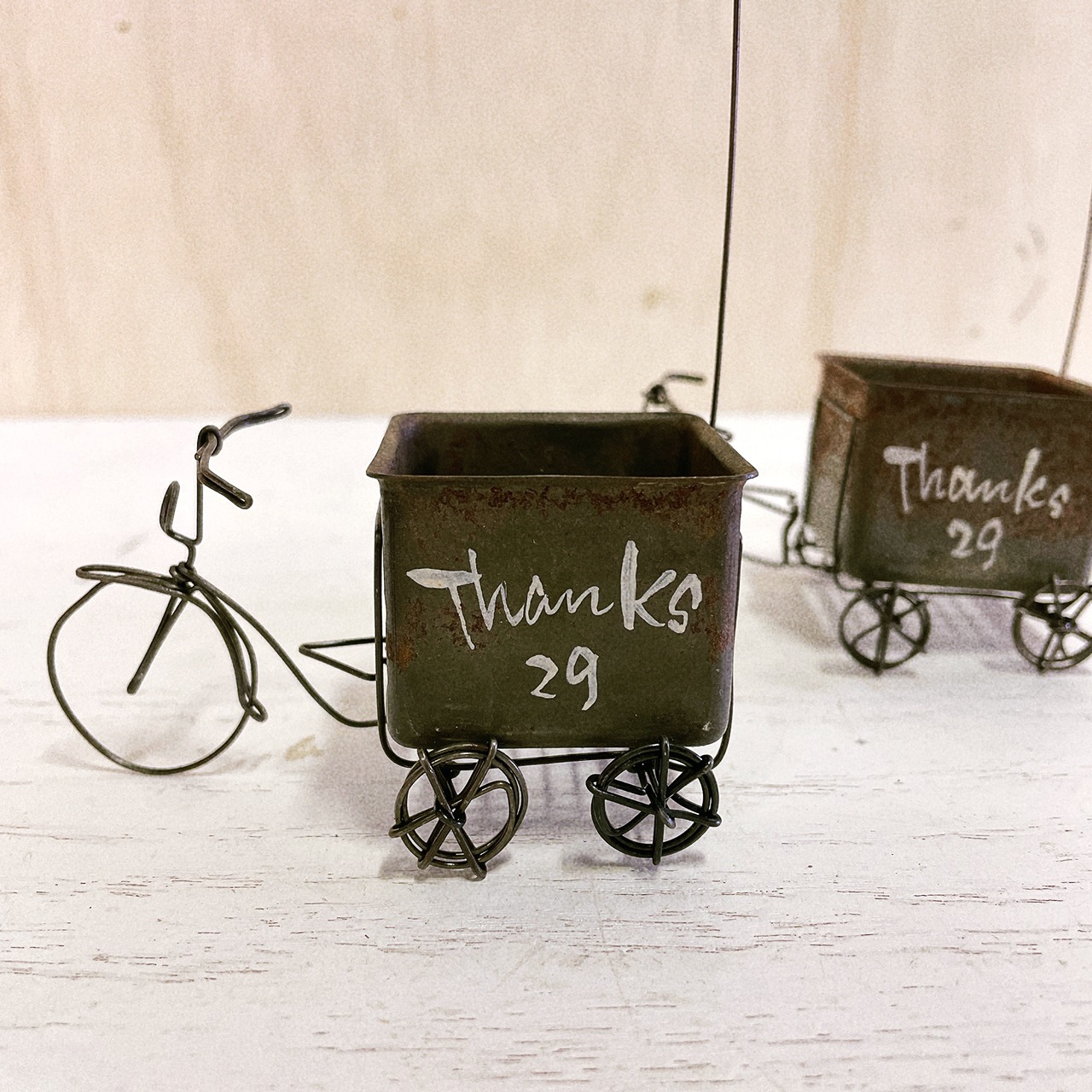 ワイヤーで作った五輪車に菓子型のBOXを付けたミニミニプランターです♪