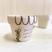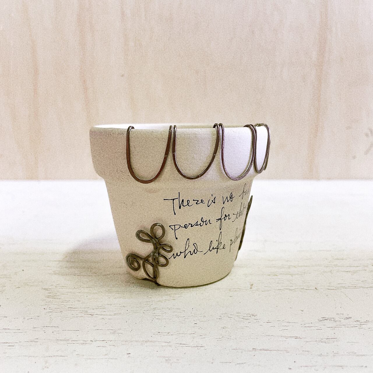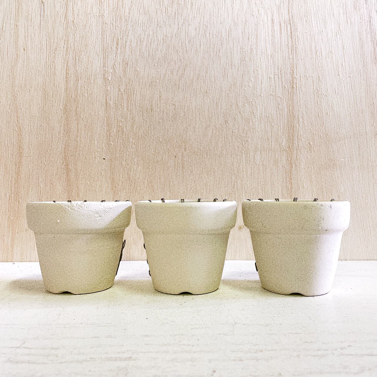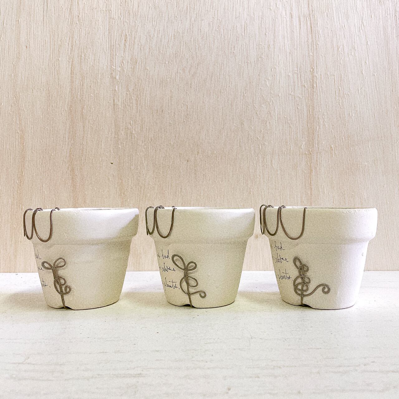 白くペイントした2.5号の丸鉢に潰しのワイヤーでアレンジを施したリメ鉢です♪