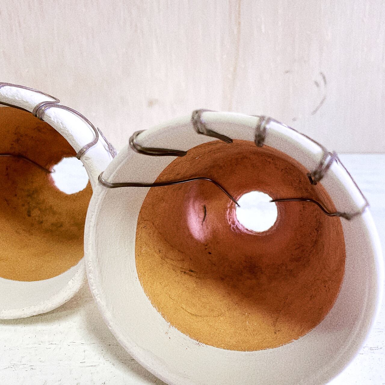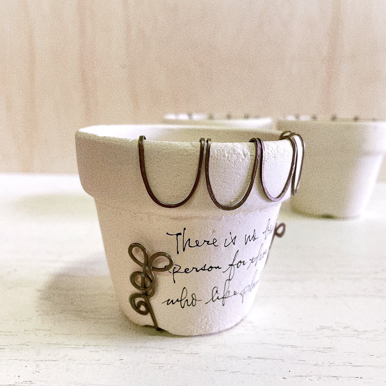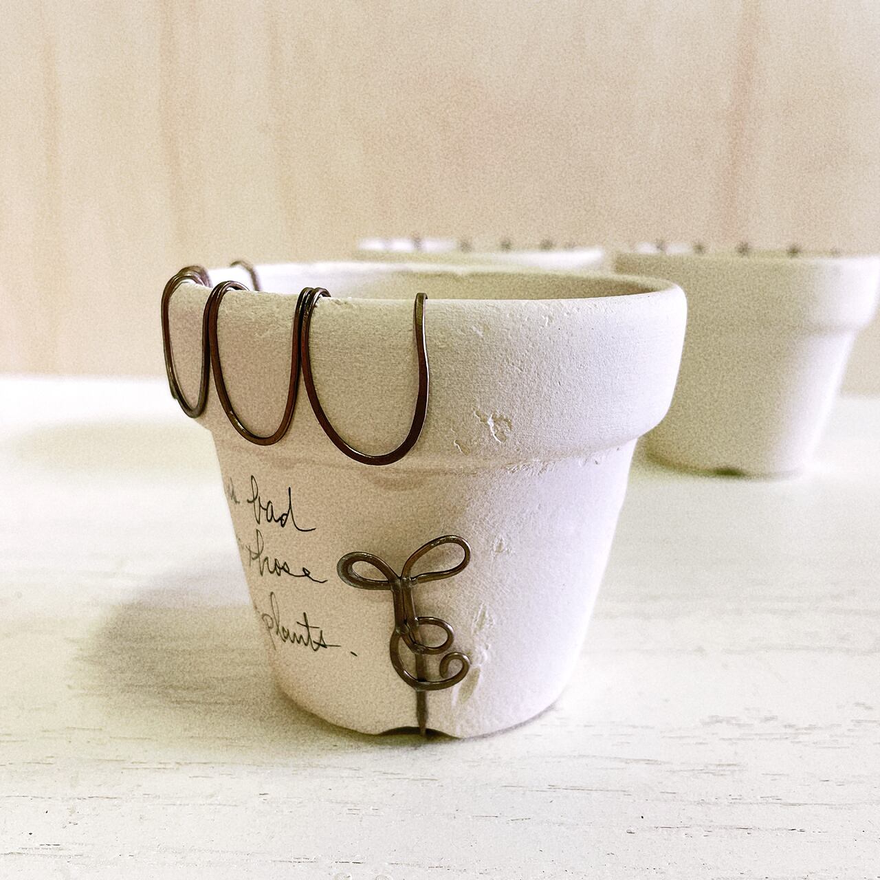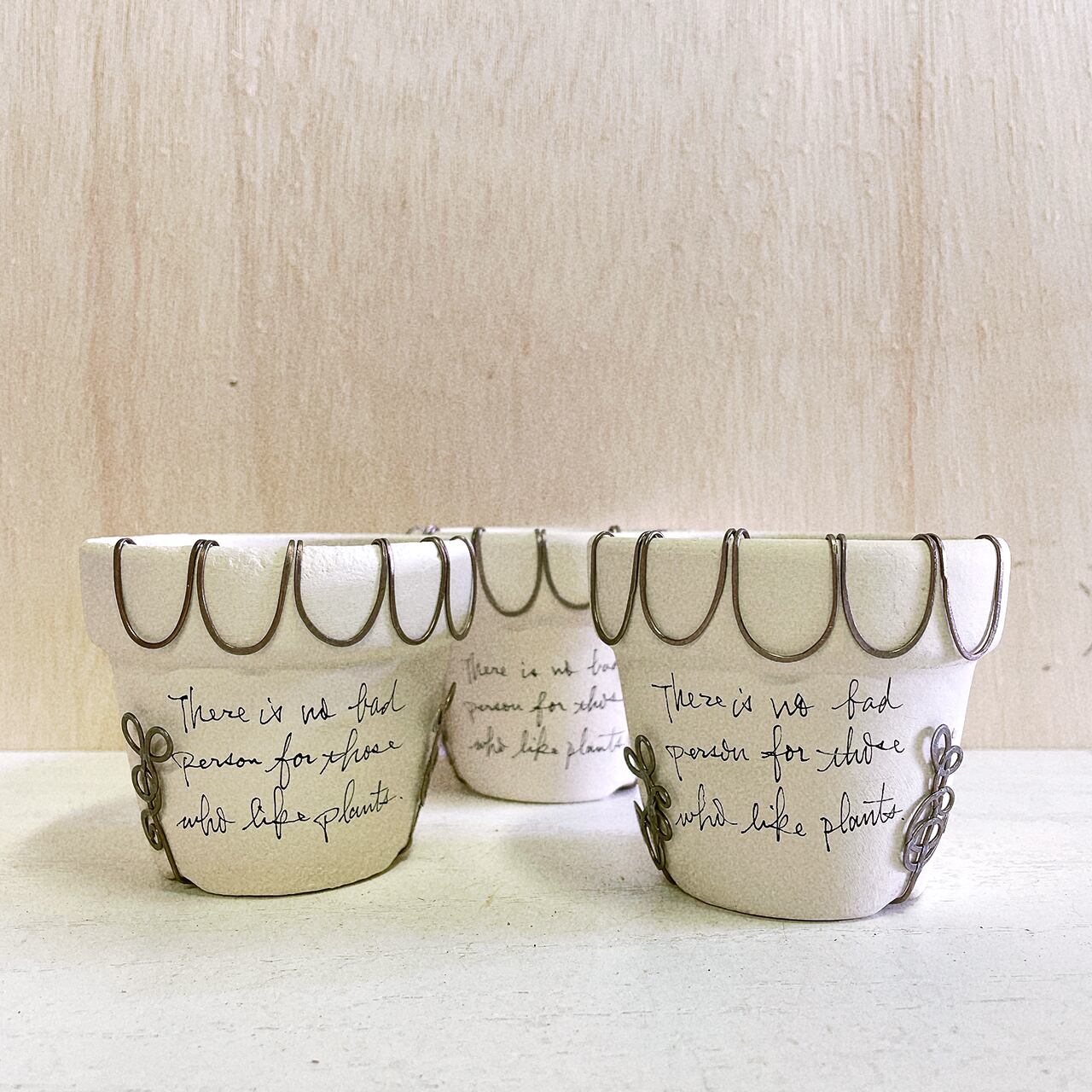 白くペイントした2.5号の丸鉢に潰しのワイヤーでアレンジを施したリメ鉢です♪